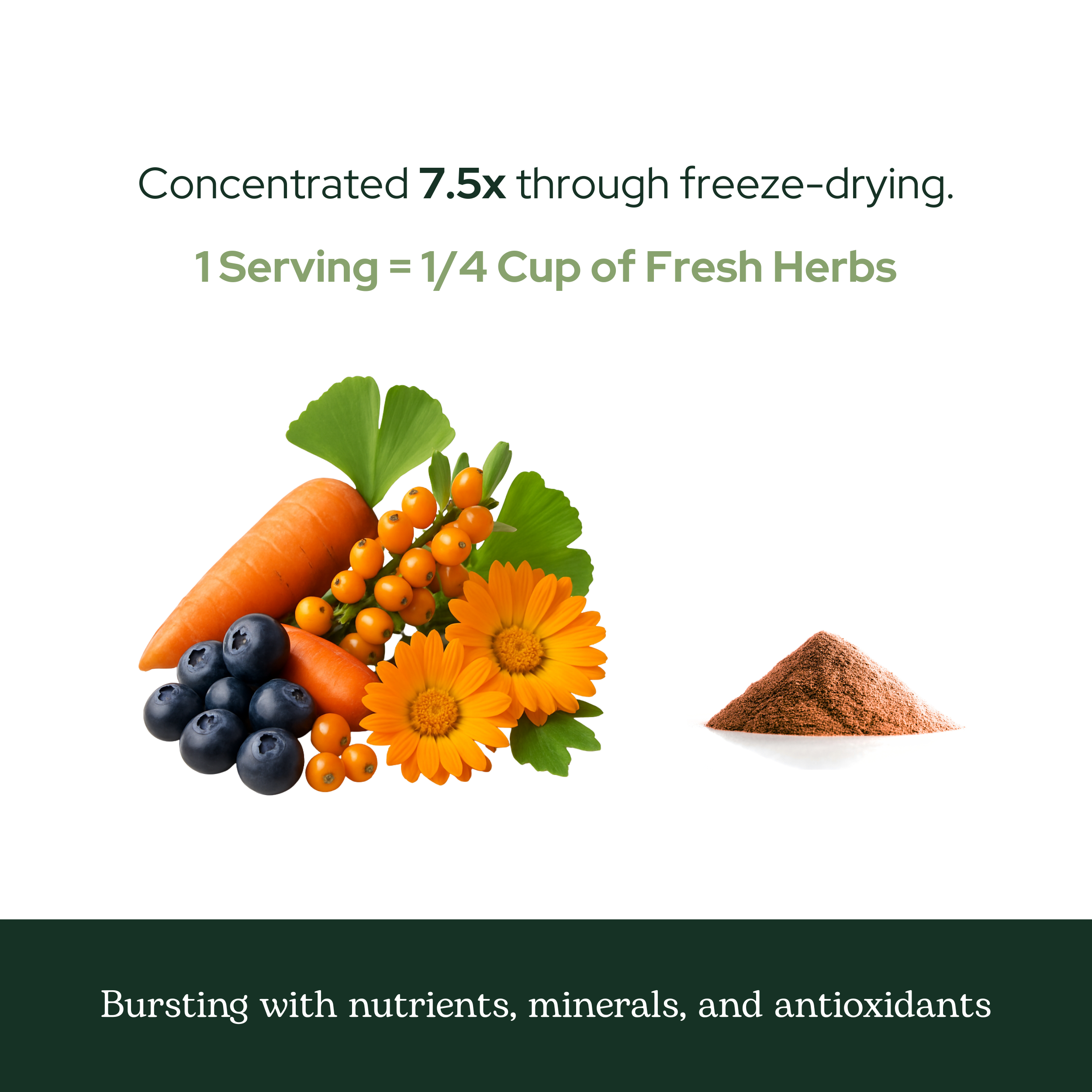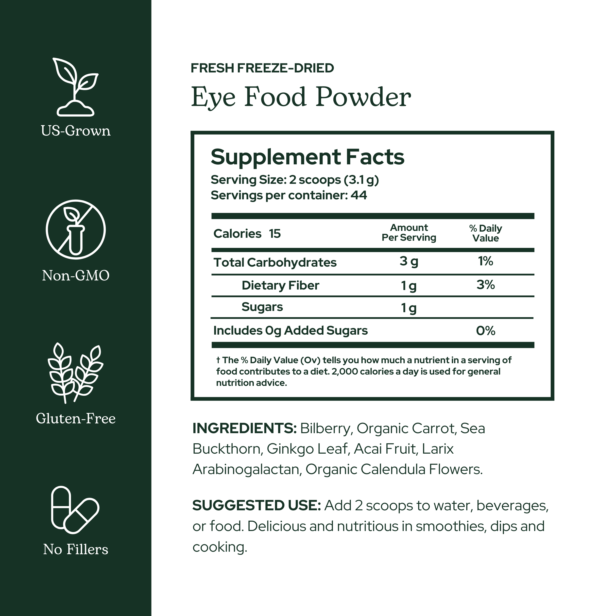Ingredients: Raw, wildcrafted, freeze-dried bilberry fruit (Vaccinium myrtillus), freeze-dried carrot (Daucus carota), freeze-dried sea buckthorn juice (Hippophae rhamnoides), raw freeze-dried golden ginkgo leaf (Ginkgo biloba), freeze-dried acai fruit (Euterpe oleraceae), larix arabinogalactan, organic calendula flower.