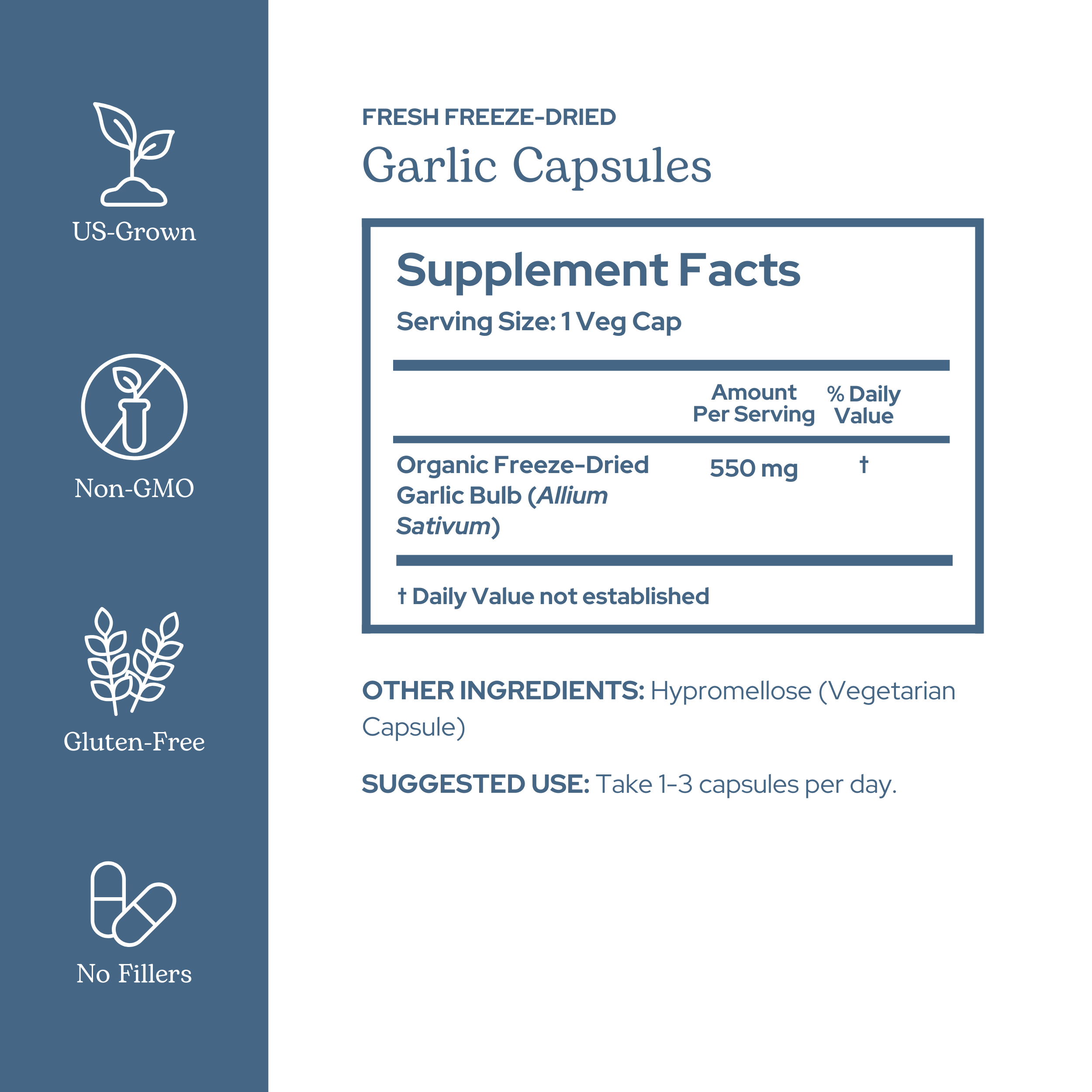 Ingredients: Raw US-Grown Organic Fresh Freeze-dried Garlic bulb (Allium sativum)