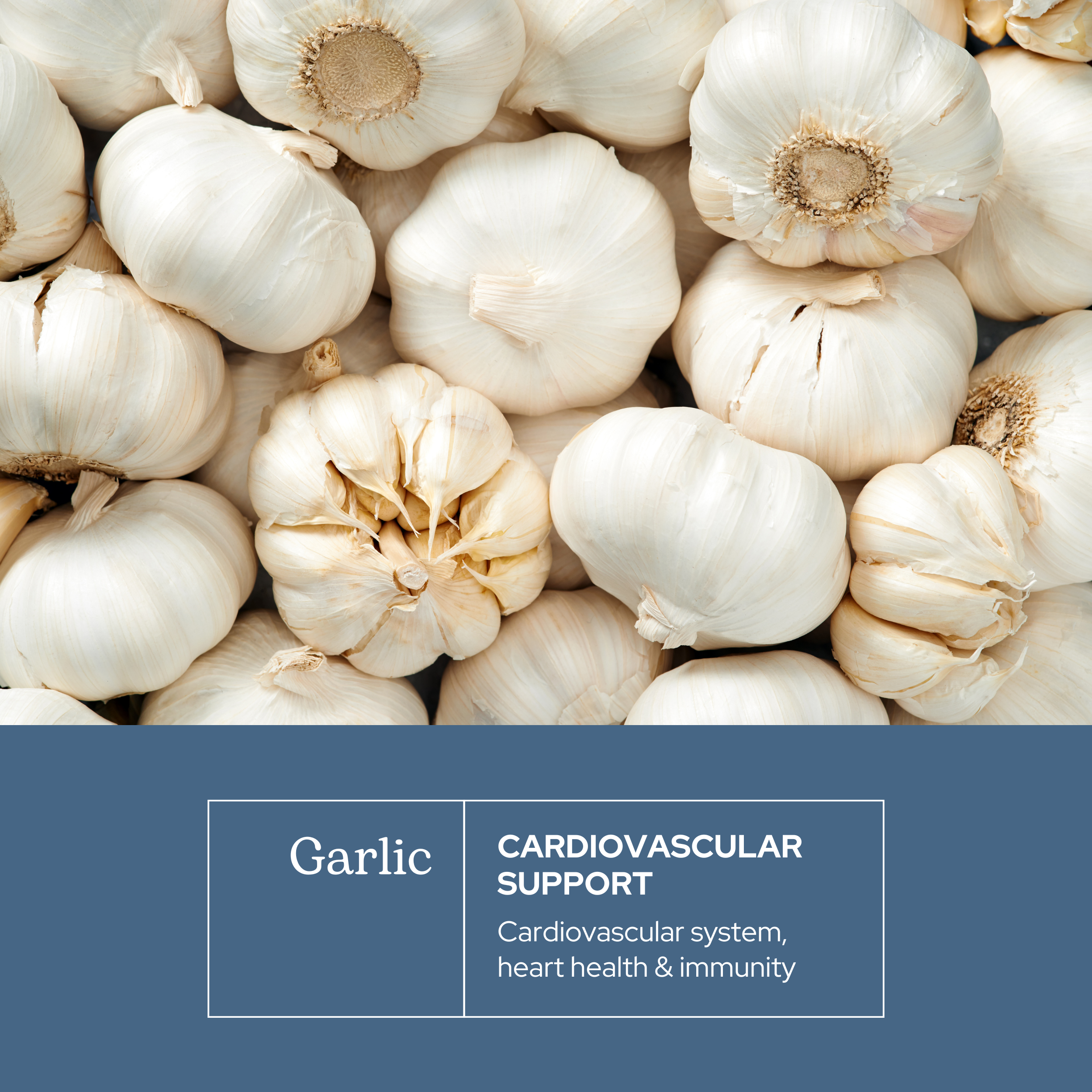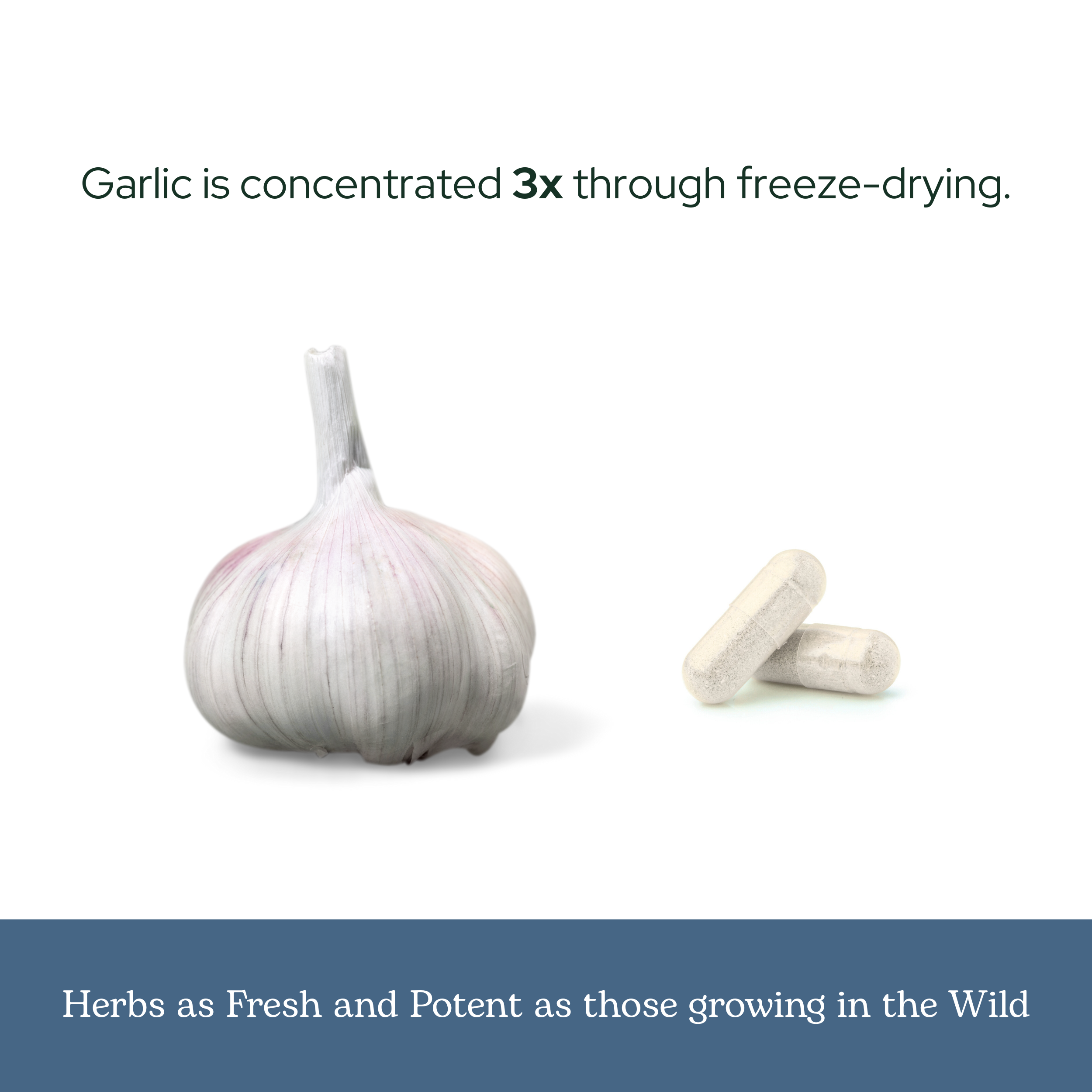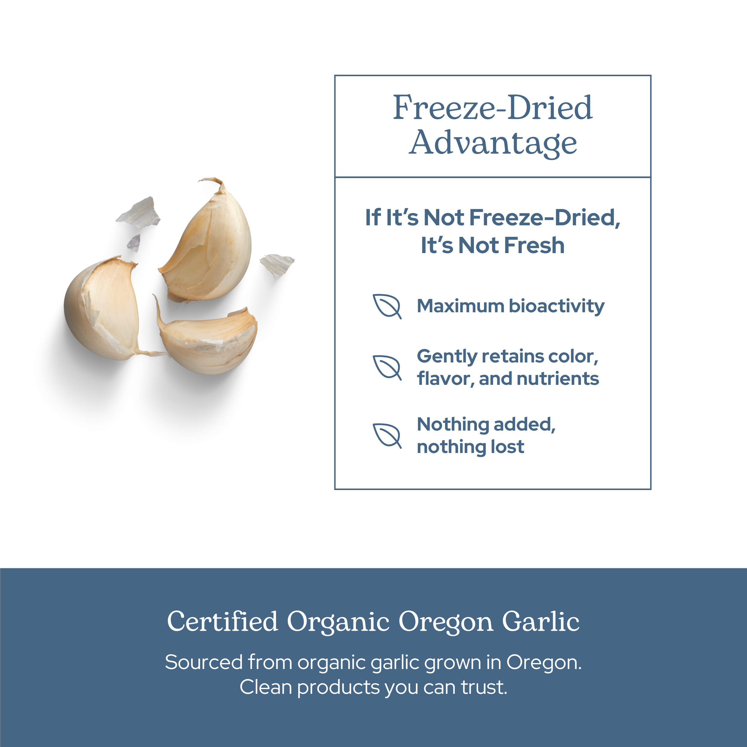 Organic US-grown garlic is small batch freeze-dried in-house to retain the nutrients and wholesome goodness of the fresh plant. Freeze-drying maintains the activity and phytochemicals of the fresh plant to support cardiovascular and immune health.*