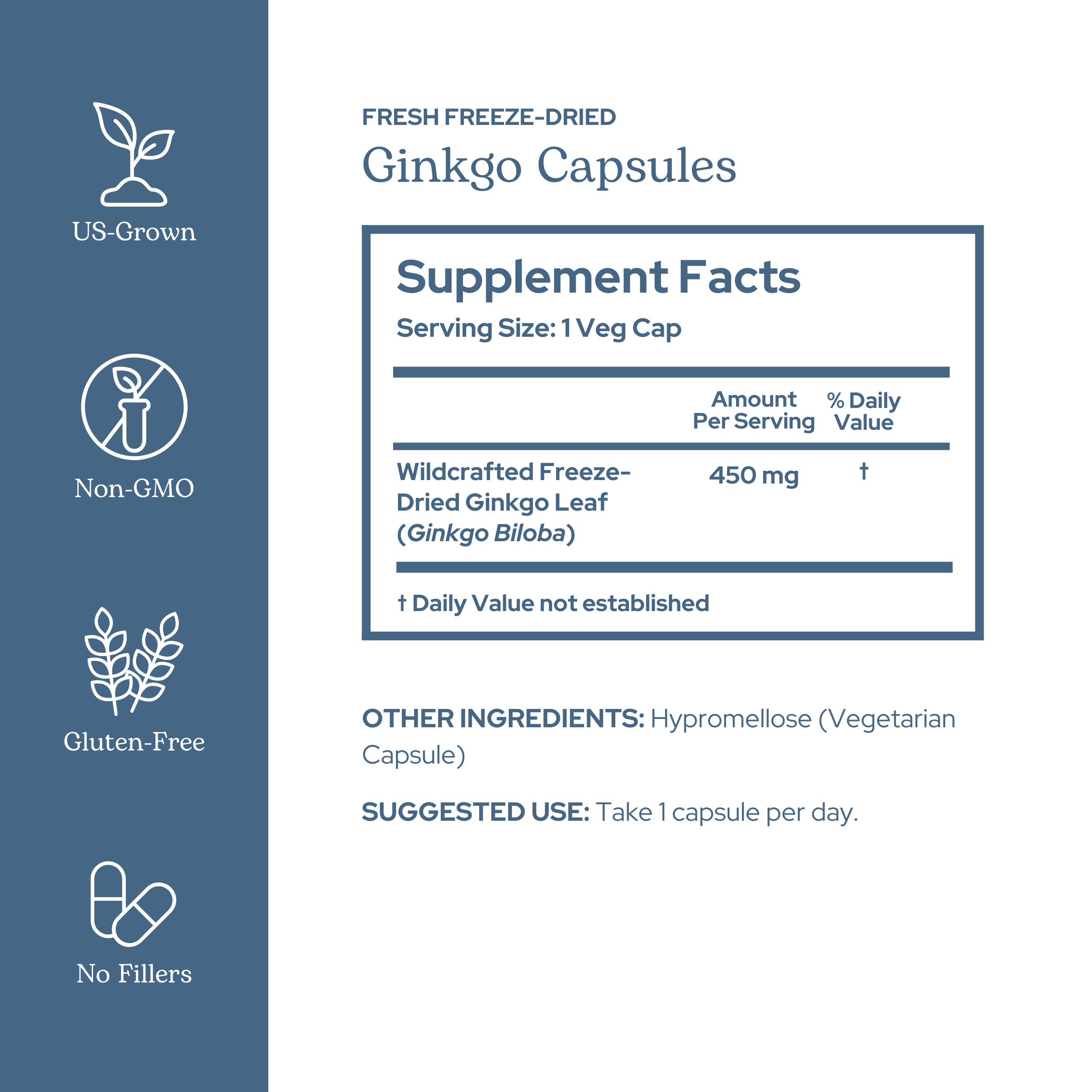 Ingredients: Raw Fresh Freeze-dried US-Grown Organic Ginkgo leaf (Ginkgo biloba)