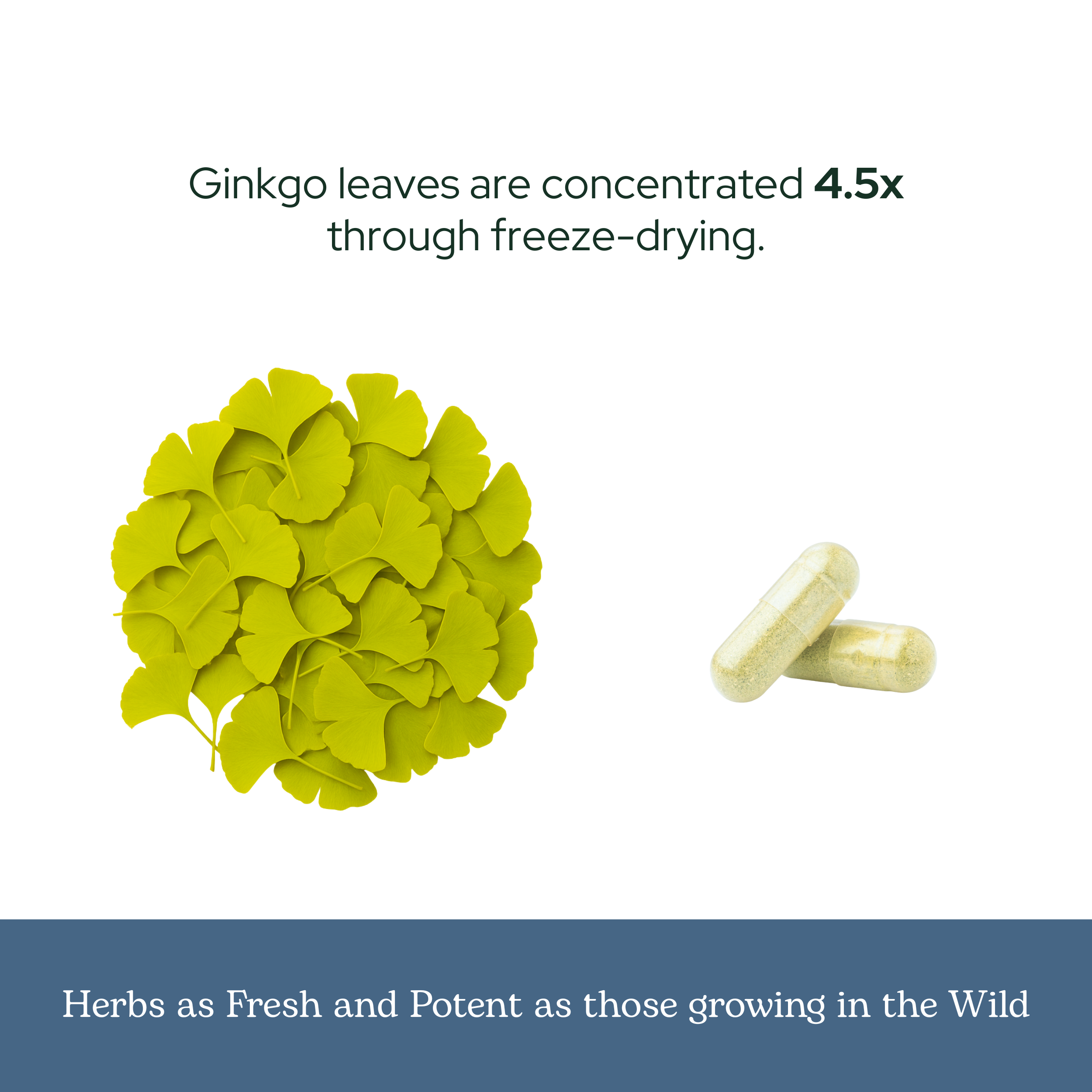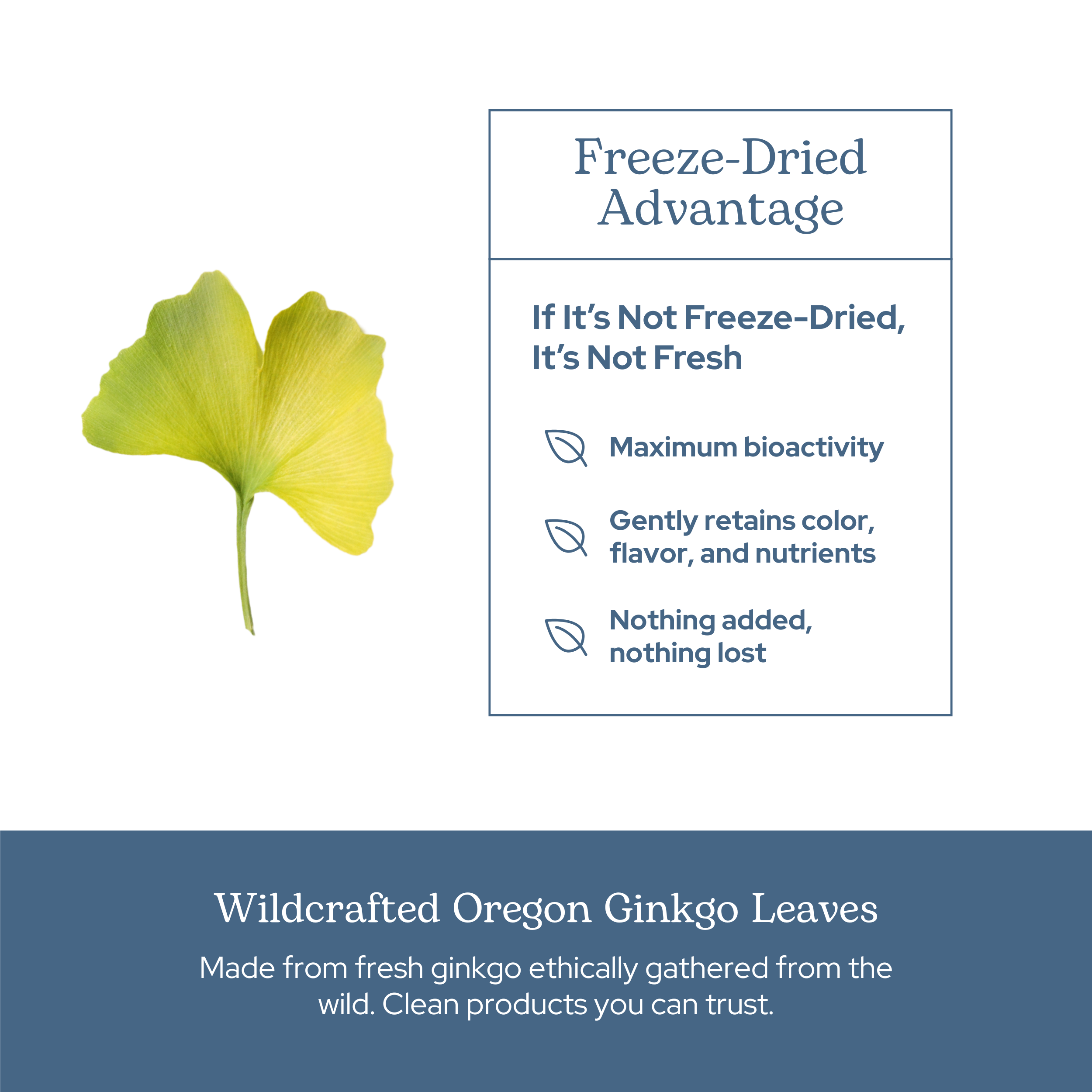Organic Oregon-grown ginkgo leaves are small-batch freeze-dried in-house to retain the nutrients and wholesome goodness of the fresh plant. Freeze drying maintains the activity and phytochemicals of the fresh plant to support memory, cognition, and circulation.* The closest thing to an herb picked fresh from your garden. No fillers, no additives, no air-drying, no extracts, simply whole herb in a capsule.