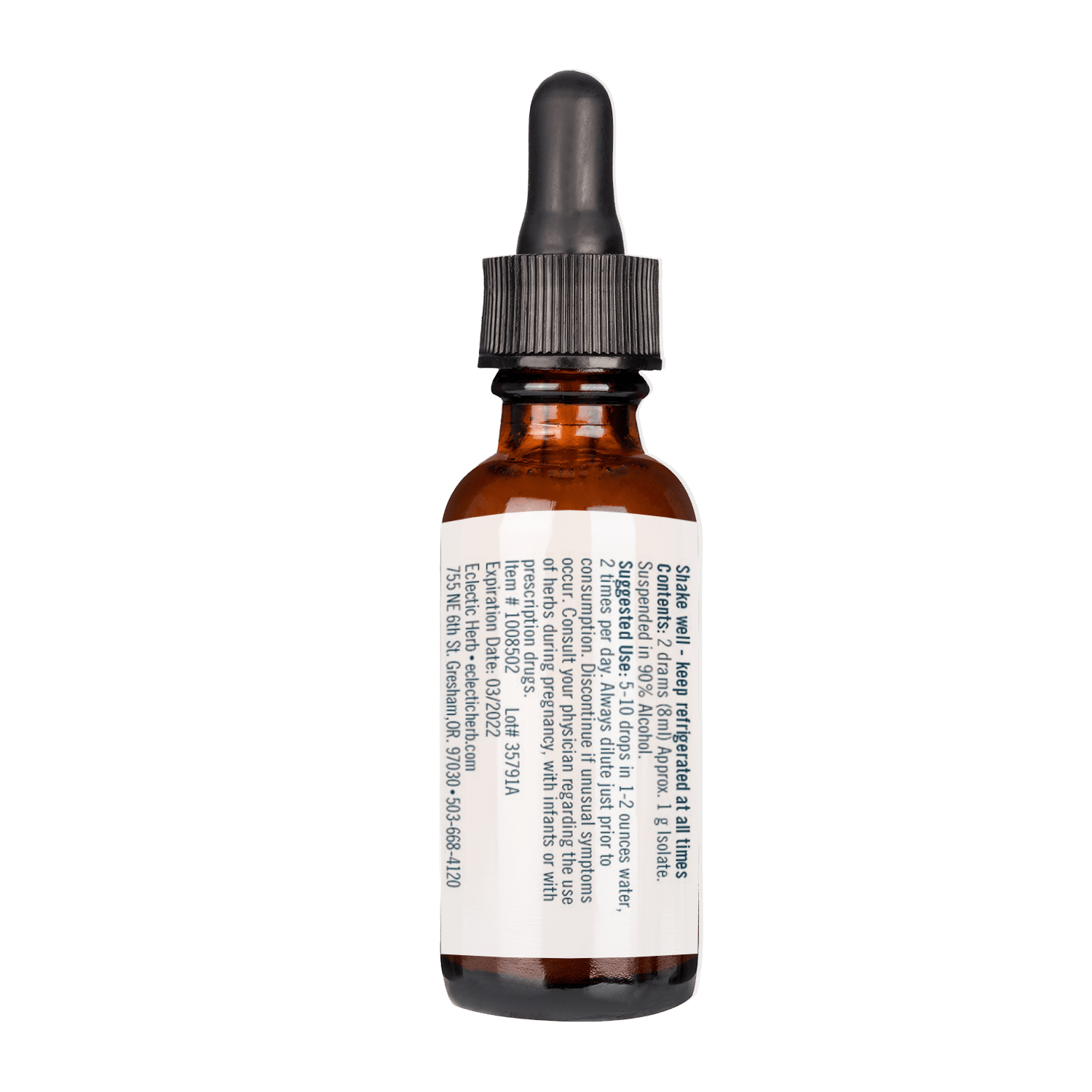 SUGGESTED USE: 5-10 drops in 1-2 ounces water, 2 times per day. Always dilute just prior to consumption. Discontinue use if unusual symptoms occur. Consult your physician regarding the use of herbs during pregnancy, with infants or with prescription drugs.