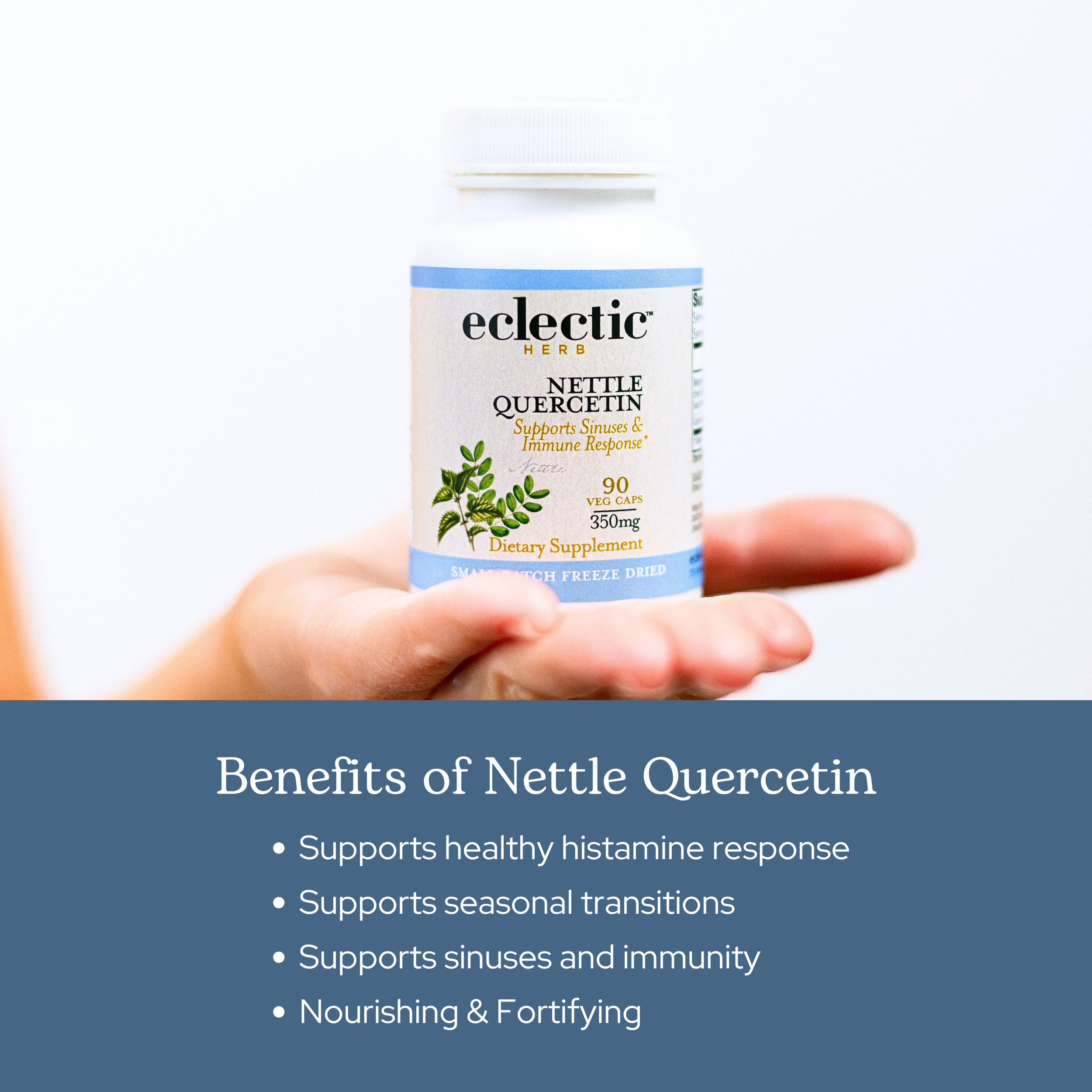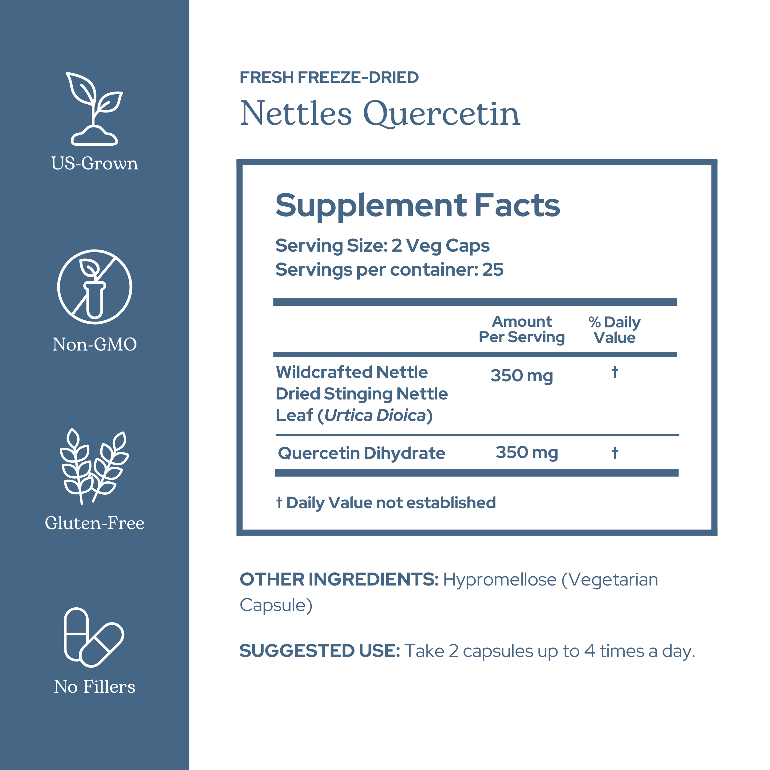 Ingredients: Wildcrafted fresh freeze-dried Stinging Nettle (Urtica dioica) leaf and Quercetin dihydrate (plant-based).
