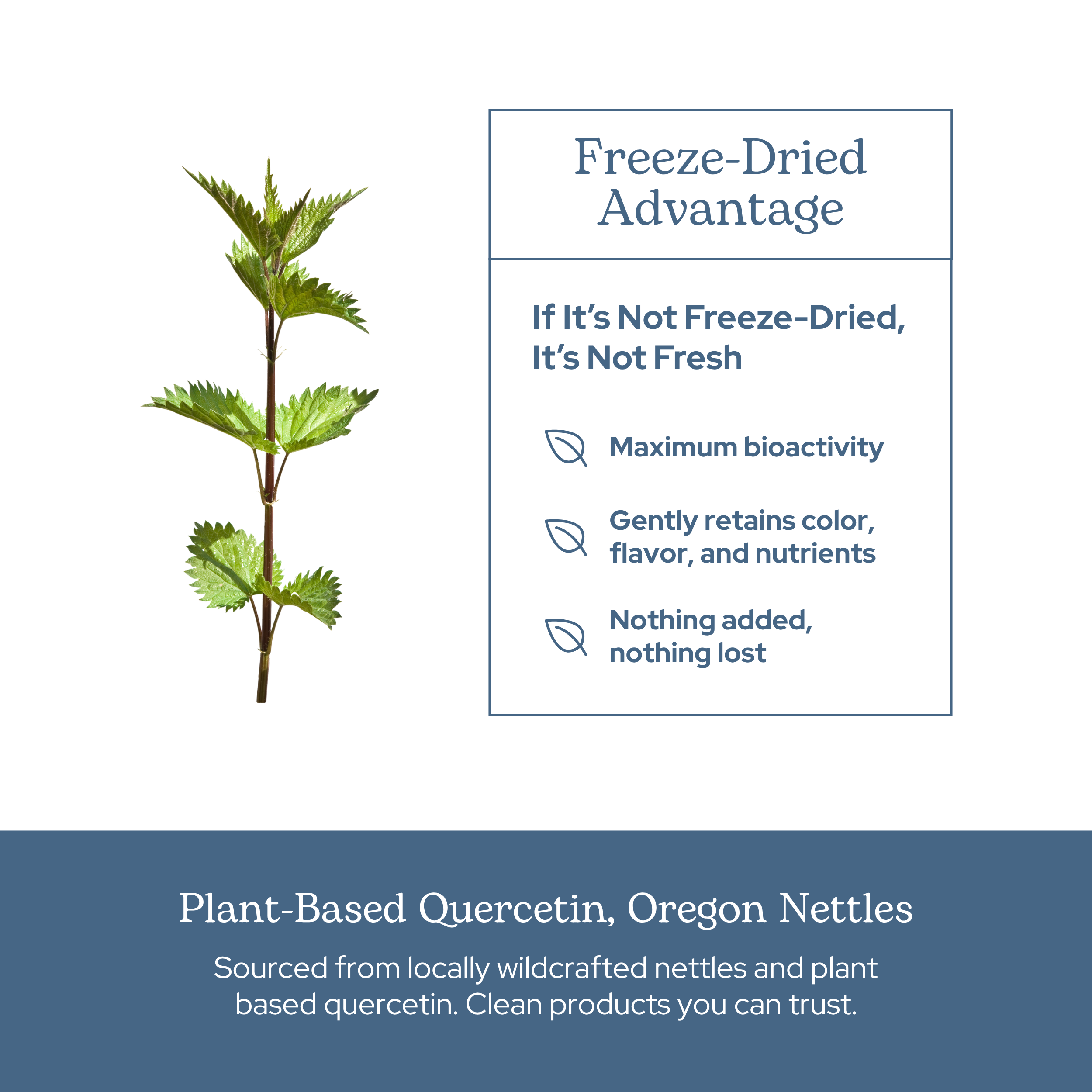 We freeze-dry our nettle at peak freshness to preserve its full spectrum of nutrients and pair it with plant-based quercetin for a synergistic blend that helps you feel balanced and clear—season after season.