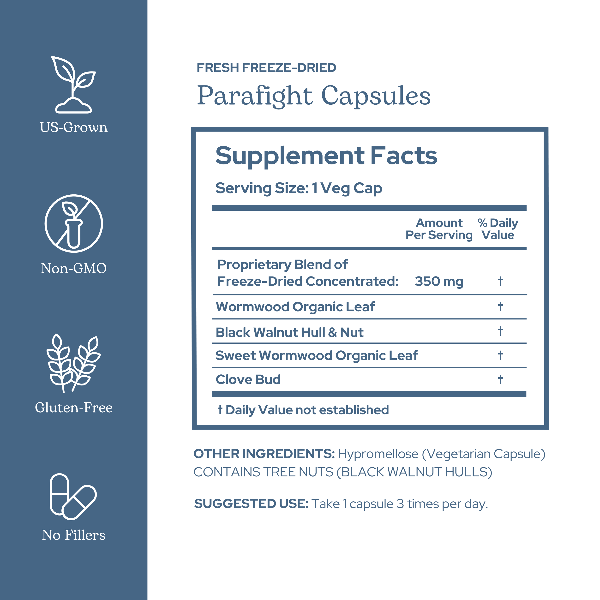 Ingredients: Freeze-dried concentrate of Black Walnut (Juglans nigra) green outer hull, concentrate of organic Wormwood (Artemisia absinthium) flower and leaf, concentrate of Clove (Syzygium aromaticum) flower, organic Wormwood (Artemisia annua) leaf.