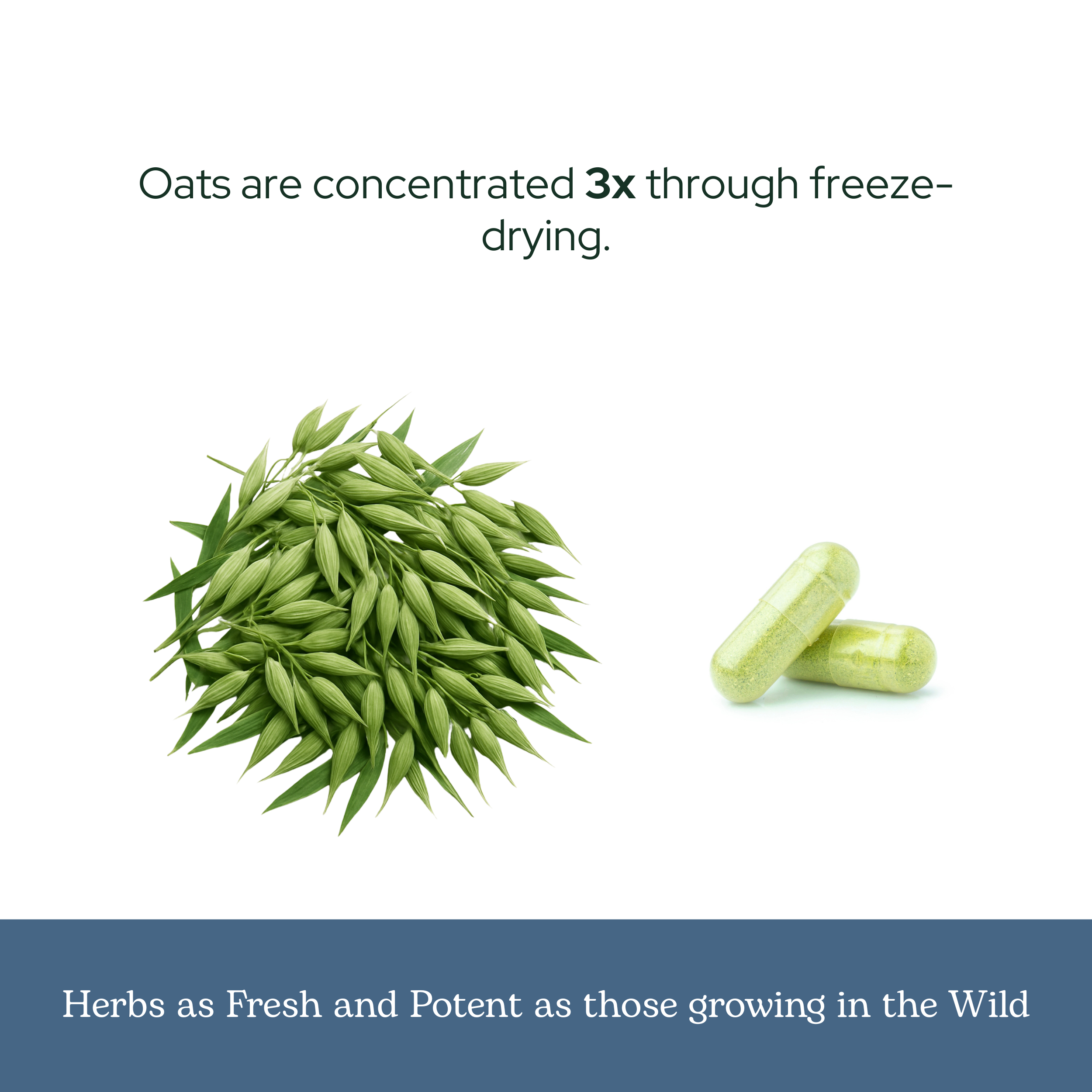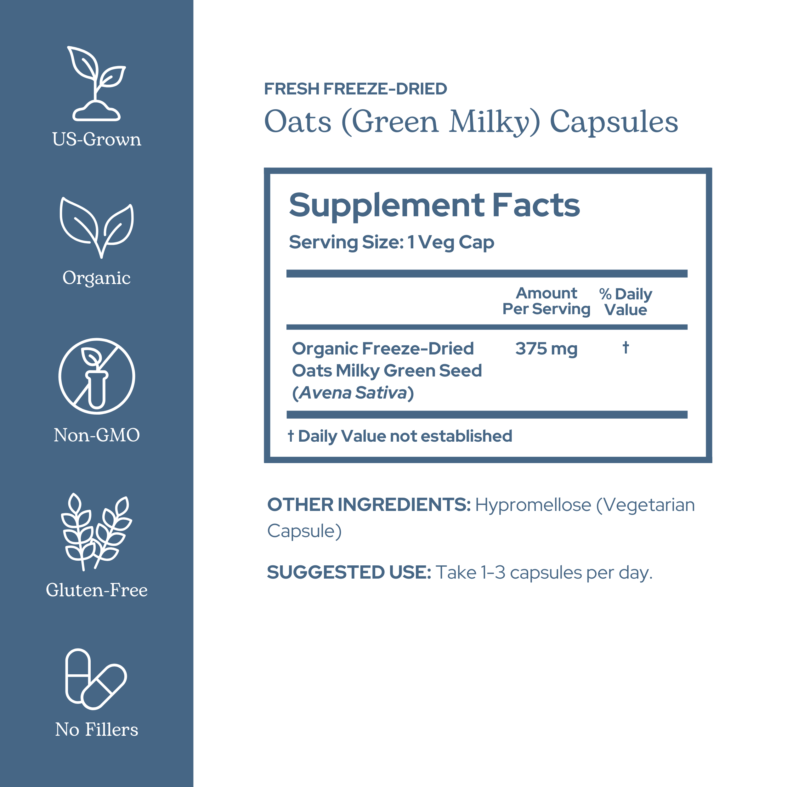 Our Green Milky Oats Capsules are crafted from certified organic, Oregon-grown oats, harvested at their peak "milky" stage, when the oat tops release a nutrient-rich sap prized by herbalists for its deeply restorative benefits.