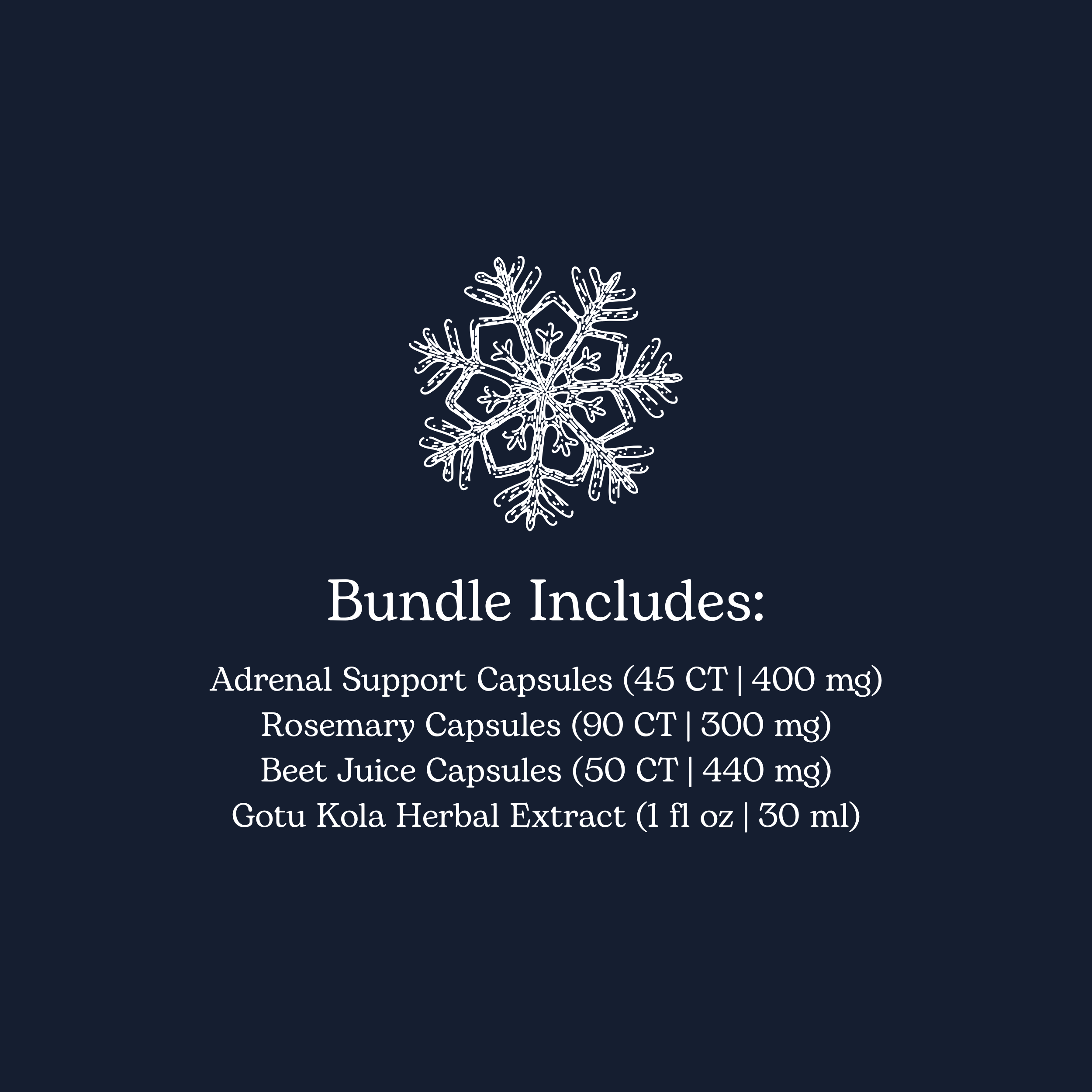 Bundle Includes: Adrenal Support Capsules (45 CT | 400 mg), Rosemary Capsules (90 CT | 300 mg), Beet Juice Capsules (50 CT | 440 mg), Gotu Kola Herbal Extract (1 fl oz | 30 ml).