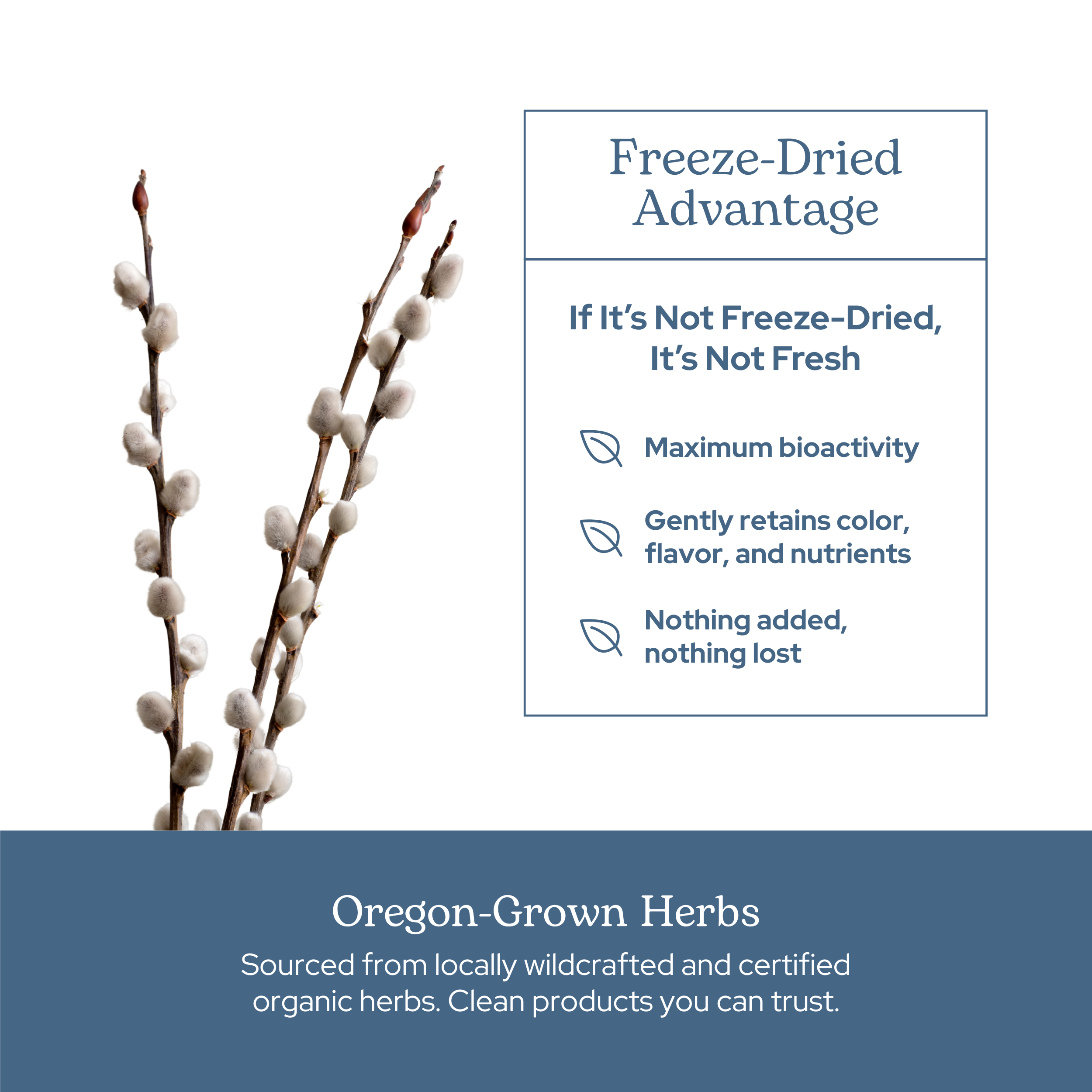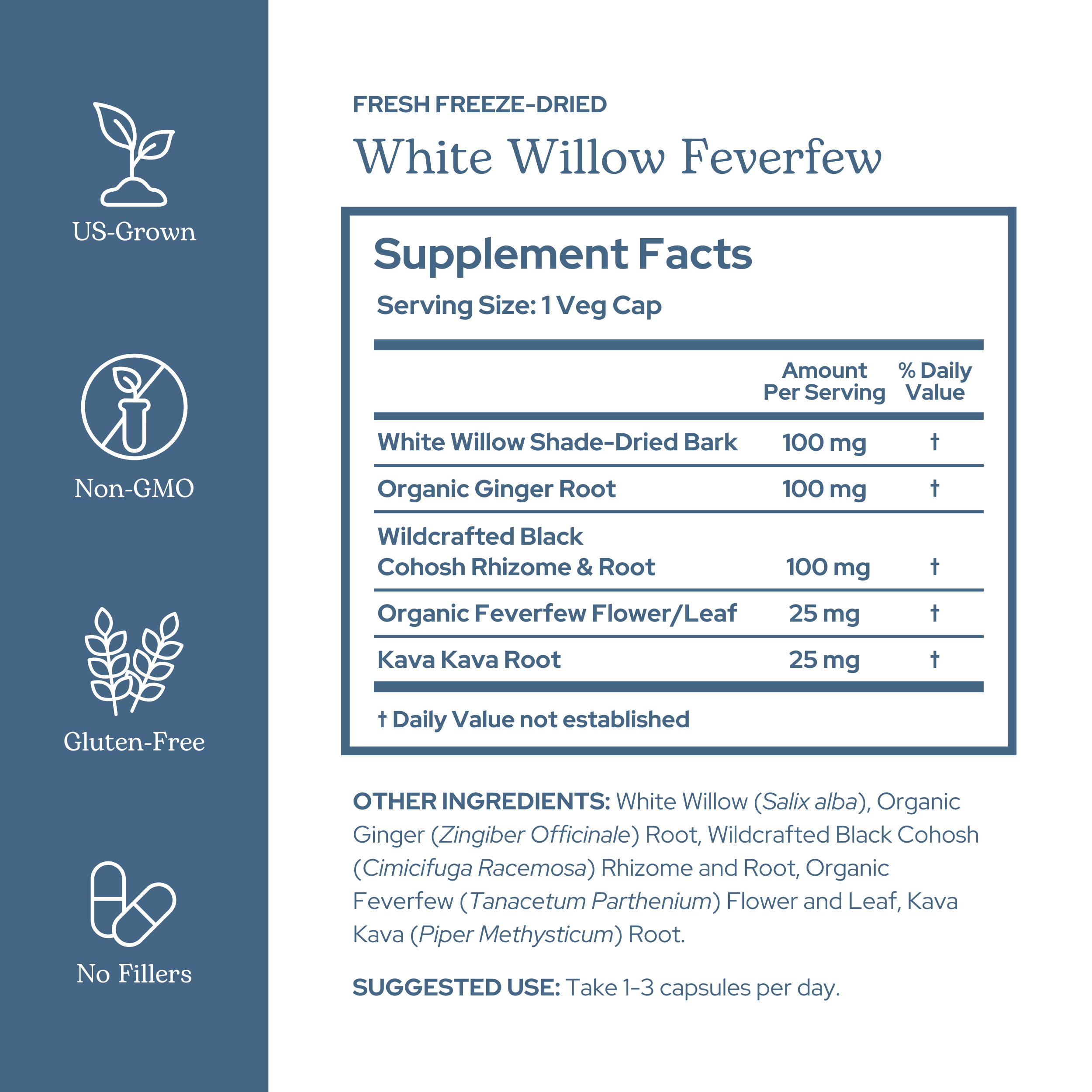 Fresh white willow bark and Oregon-grown feverfew are combined with black cohosh and ginger and small batch freeze-dried in-house to support the body's response to occasional pain.