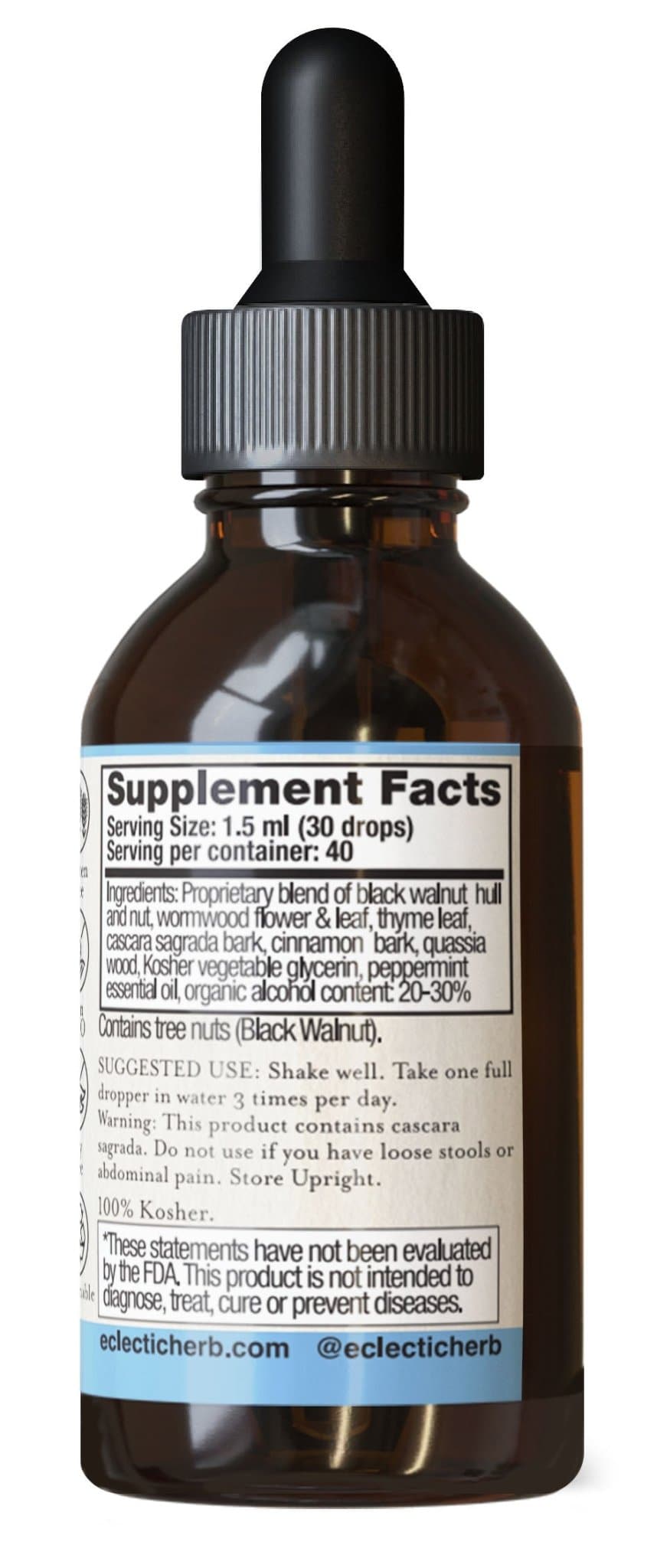 Ingredients: Wildcrafted fresh Black Walnut (Juglans nigra) green hull, organic shade-dried Wormwood (Artemisia absinthium) flower and leaf, organic shade-dried Thyme (Thymus vulgaris) leaf, wildcrafted shade-dried Cascara Sagrada (Frangula purshiana) aged bark, shade-dried Cinnamon (Cinnamomum burmannii) bark, wildcrafted shade-dried Quassia (Quassia amara) wood, filtered water, Kosher vegetable glycerin, Peppermint essential oil, organic alcohol.