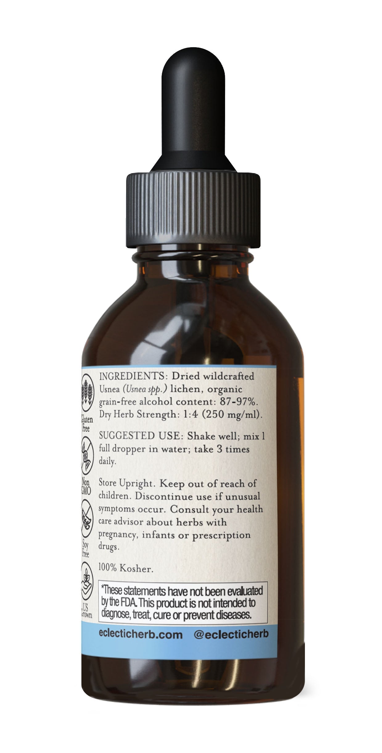 Ingredients: Wildcrafted shade-dried usnea (Usnea spp.) lichen, organic grain-free alcohol. Dry herb strength 1:4 (250 mg /ml)
