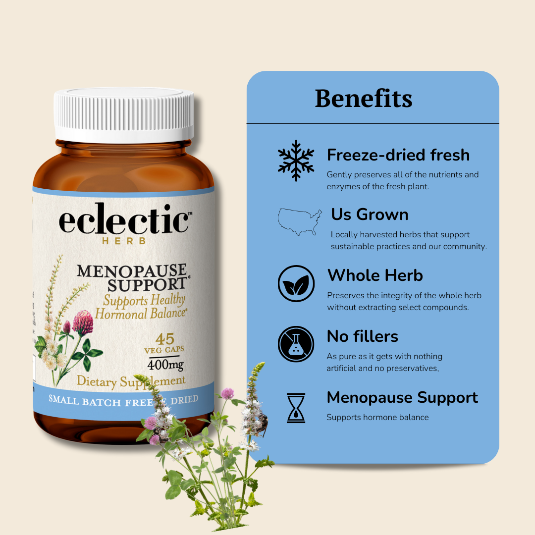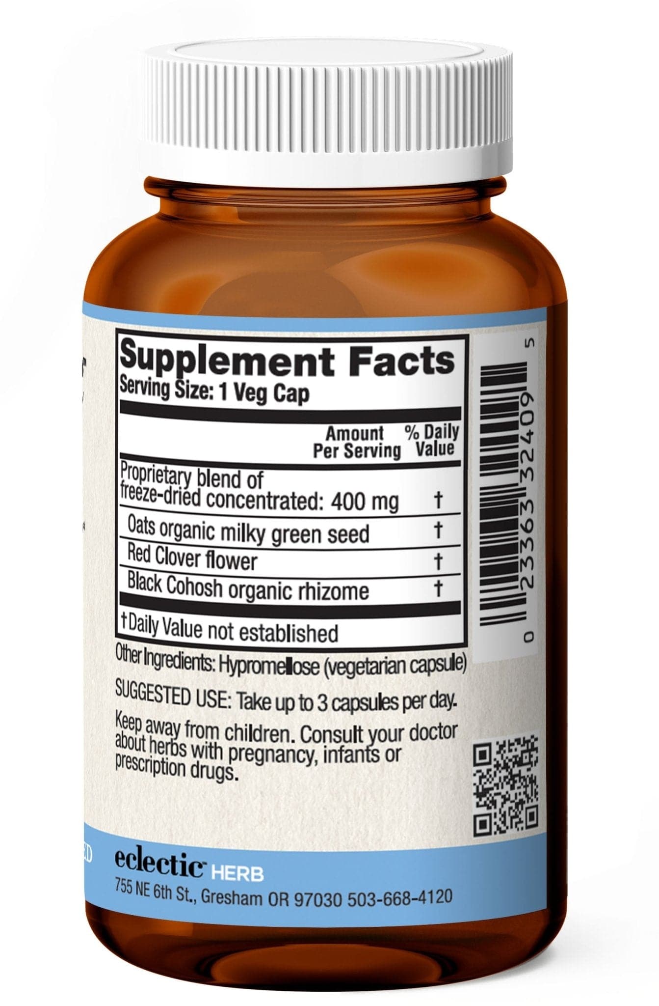 Ingredients: Proprietary blend of raw fresh freeze-dried concentrate organic green milky oat seeds (Avena sativa), organic Black Cohosh rhizome (Cimicifuga racemosa), and wildcrafted red clover flowering top (Trifolium pratense).
