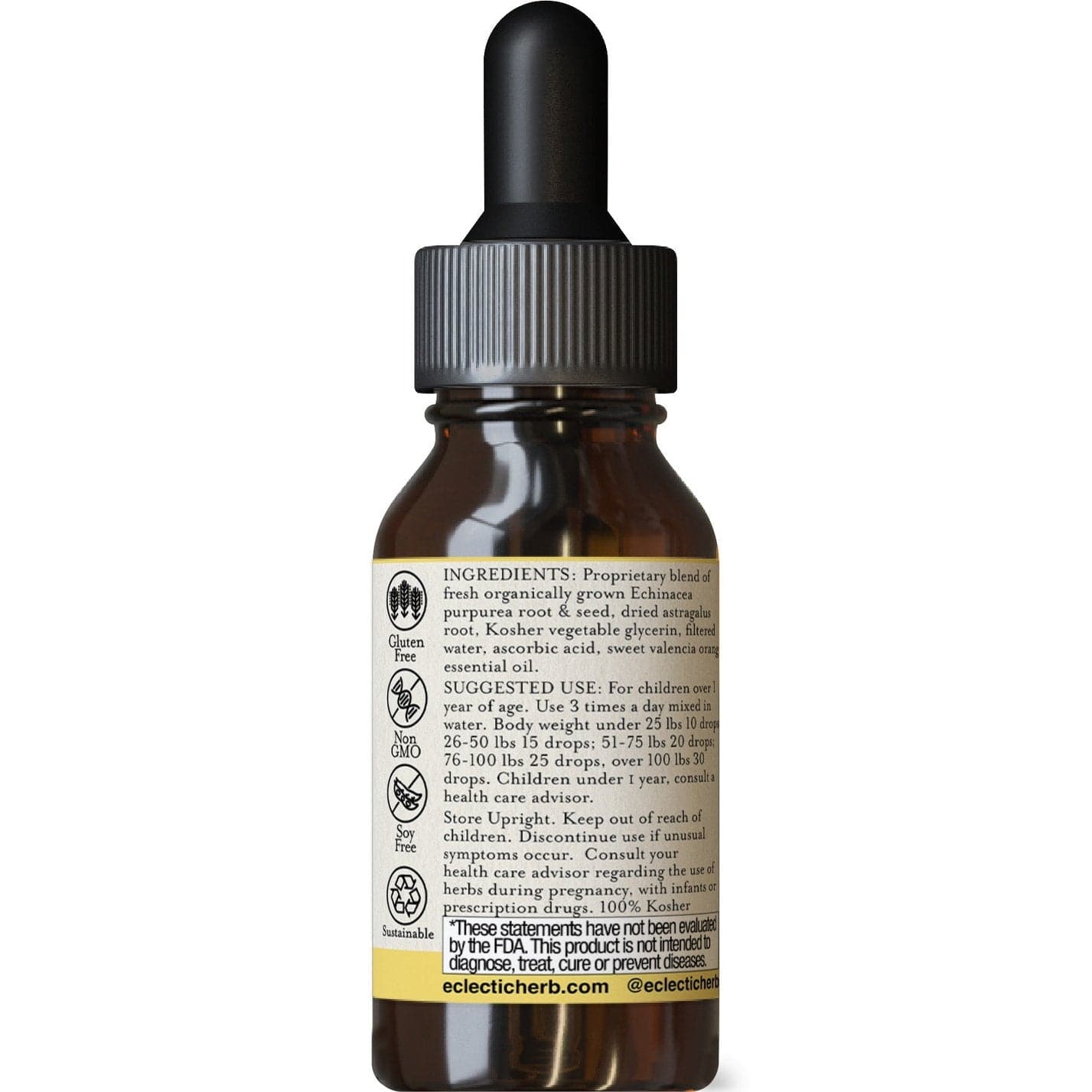 Ingredients: Organic fresh Echinacea purpurea root and seed, dried astragalus (Astragalus membranaceus) root, Kosher vegetable glycerin, filtered water, vitamin C as ascorbic acid, sweet valencia orange essential oil.