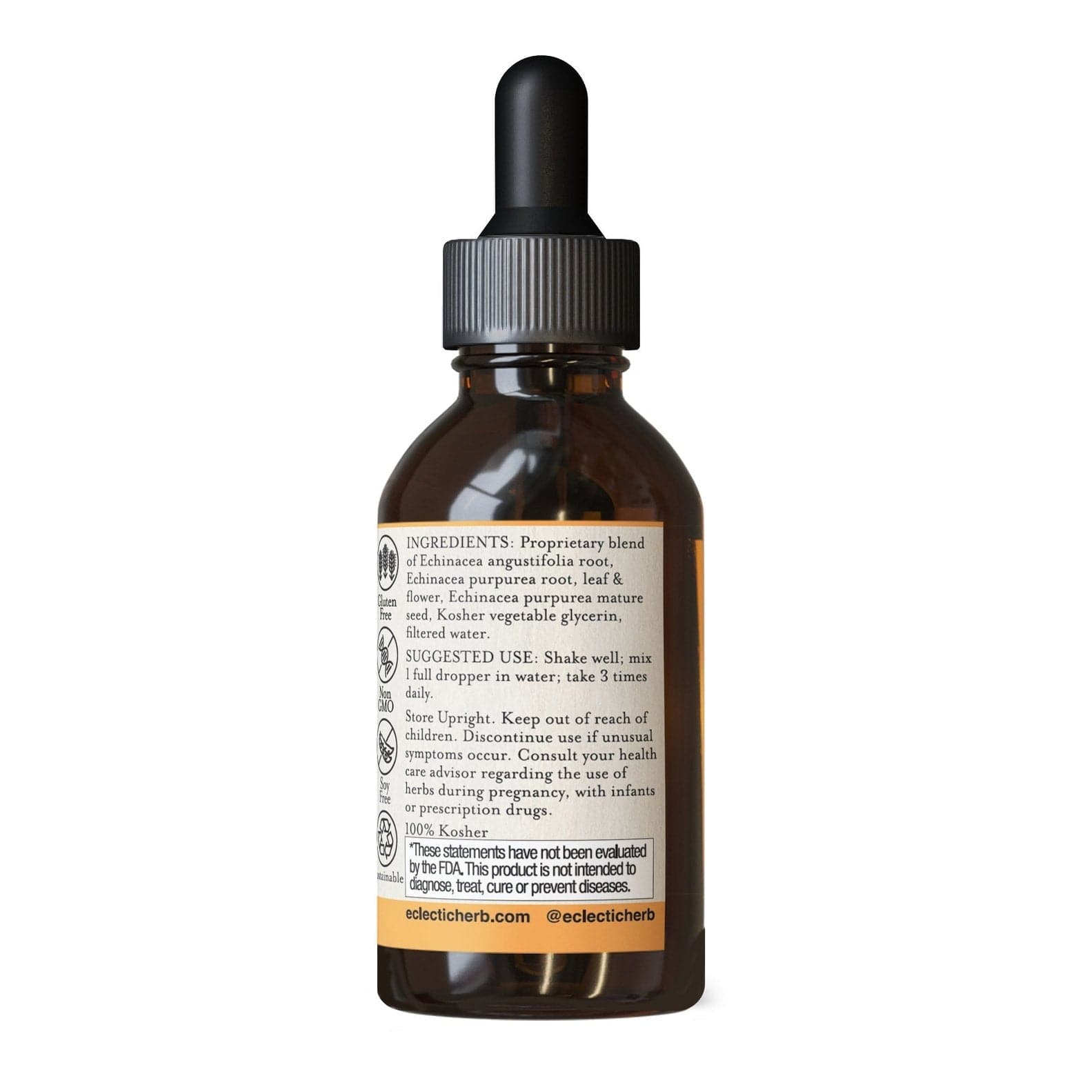 Ingredients: Organic fresh Echinacea angustifolia, root, organic fresh Echinacea purpurea root, leaf and flower, and seed, Kosher vegetable glycerin, filtered water, Vitamin C as ascorbic acid.