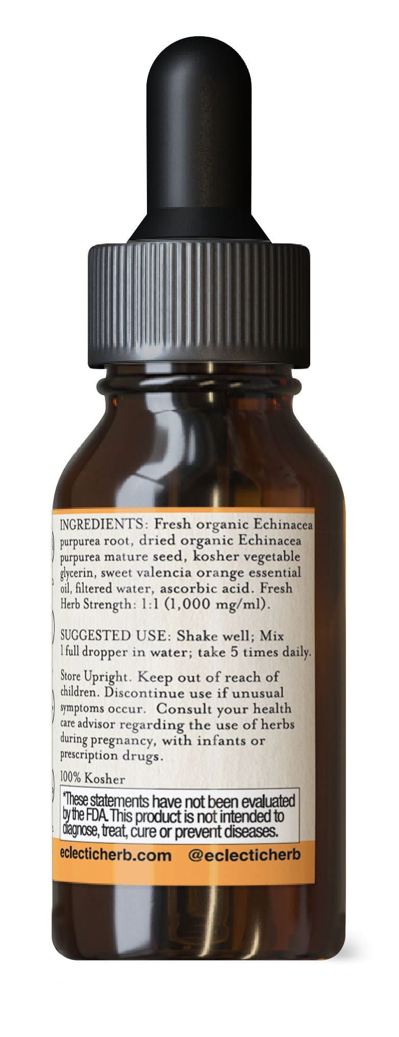 Ingredients: Organic fresh Echinacea purpurea root, dried organic Echinacea purpurea seed, Kosher vegetable glycerin, filtered water, Vitamin C as ascorbic acid, Sweet Valencia orange essential oil. Fresh herb strength 1:1 (1000 mg/ml herb equivalency)