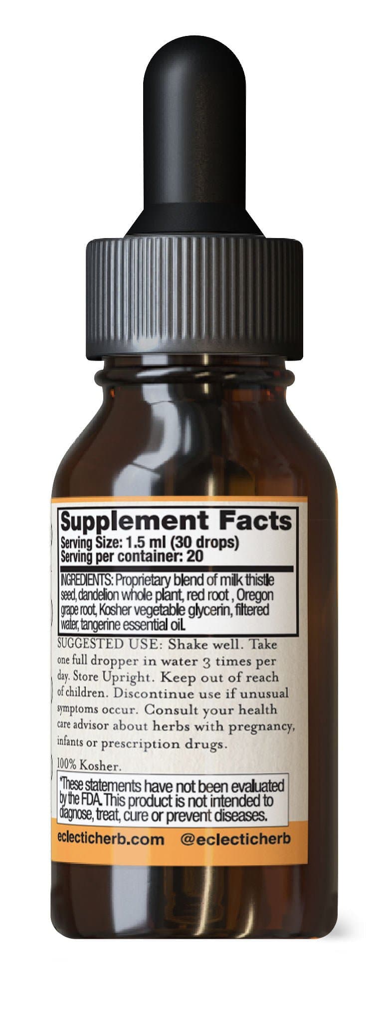 Ingredients: Organic shade-dried Milk Thistle (Silybum marianum) mature seed, wildcrafted fresh Dandelion (Taraxacum officinale) whole plant, wildcrafted shade-dried Red Root (Ceanothus americanus) root, wildcrafted fresh Oregon Grape (Mahonia aquifolium) root, Kosher vegetable glycerin, filtered water, tangerine essential oil.