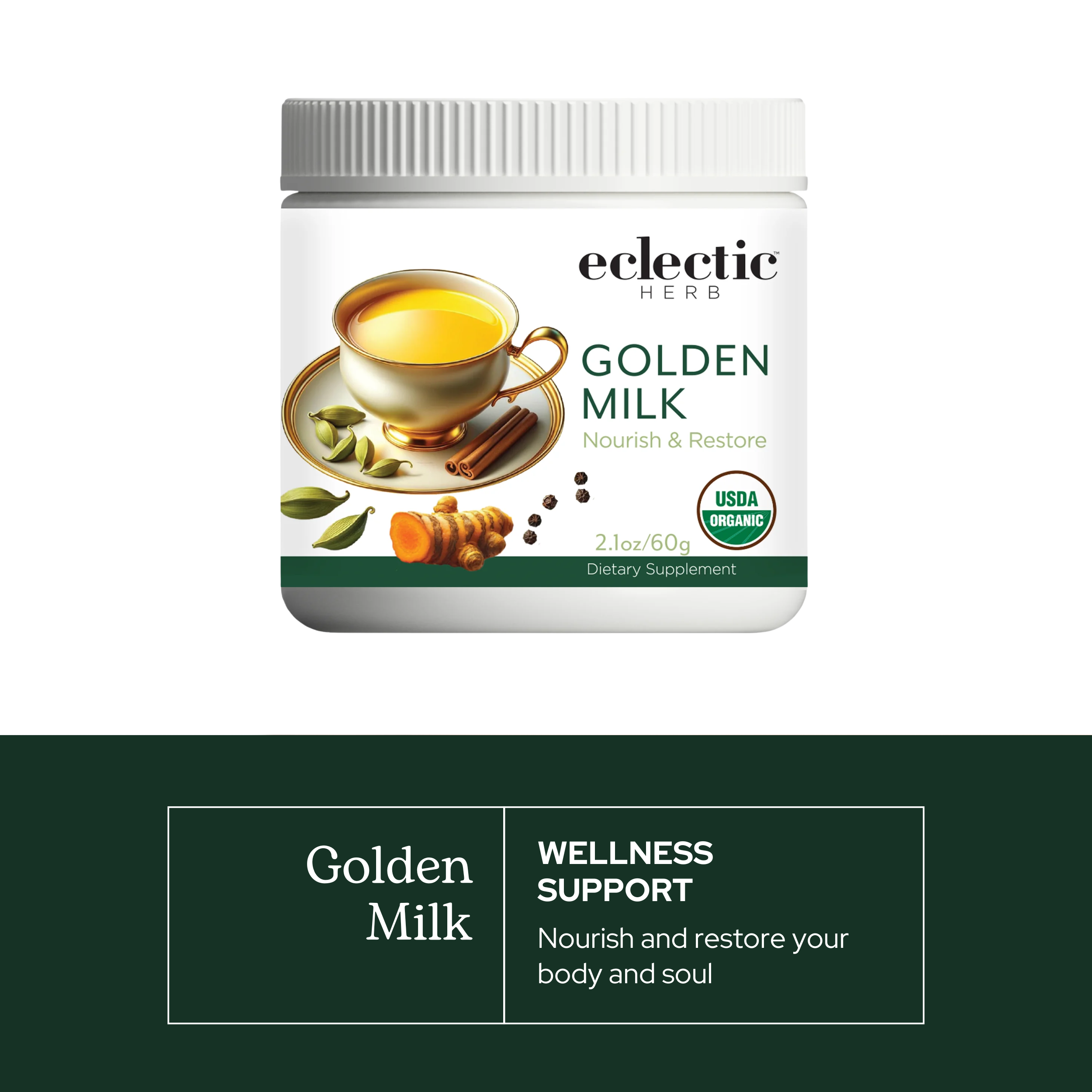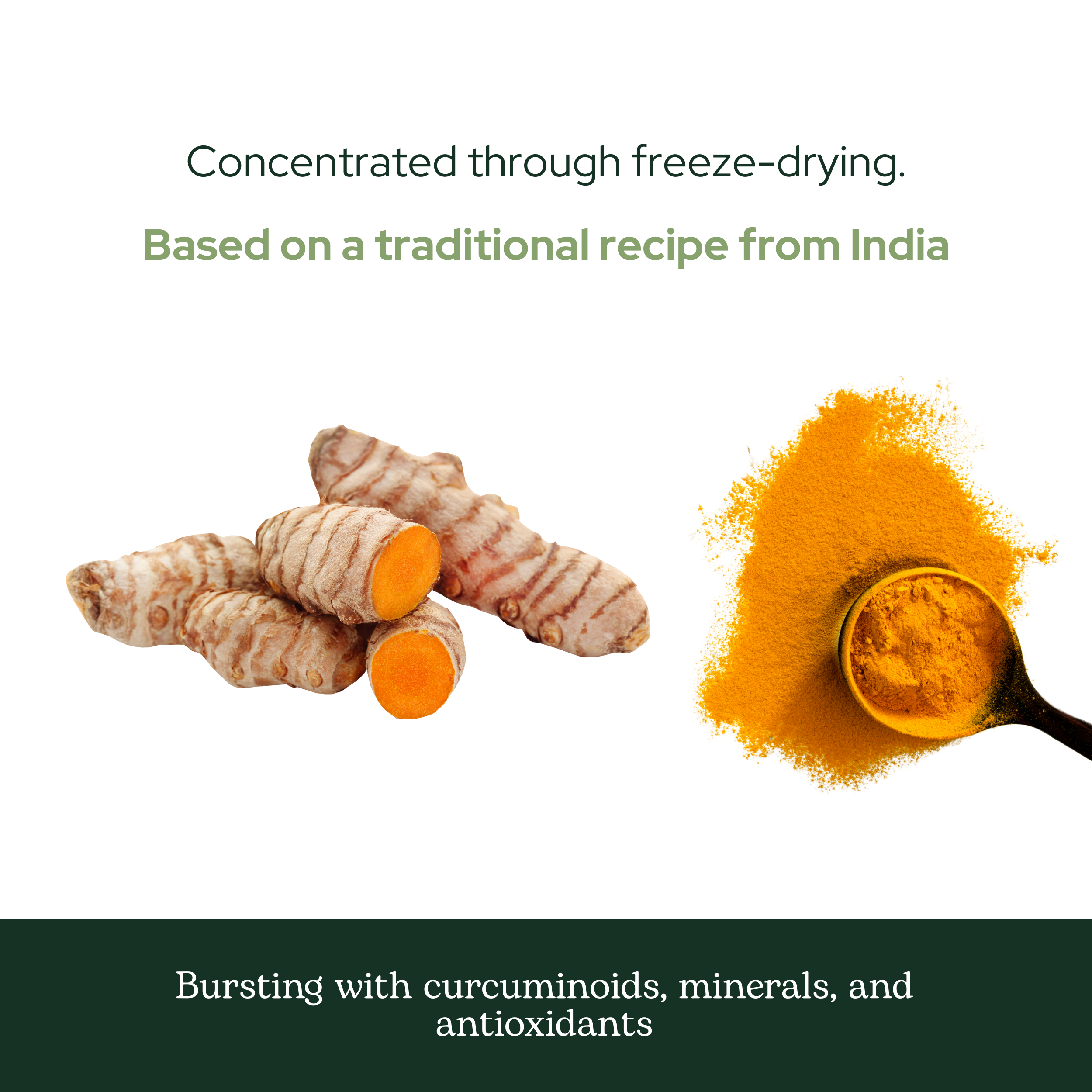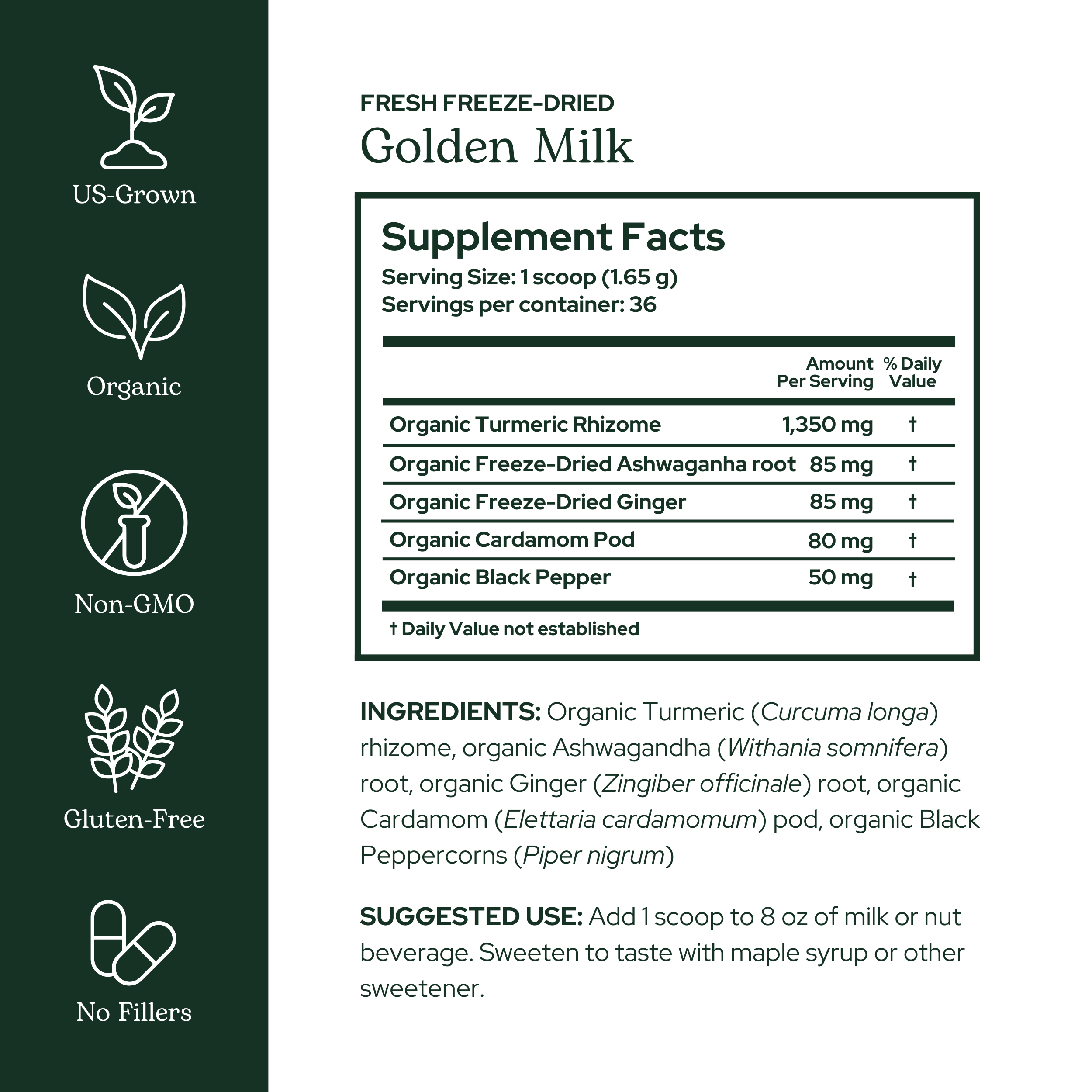 Ingredients: Organic Turmeric (Curcuma longa) rhizome, organic Ashwagandha (Withania somnifera) root, organic Ginger (Zingiber officinale) root, organic Cardamom (Elettaria cardamomum) pod, organic Black Peppercorns (Piper nigrum).