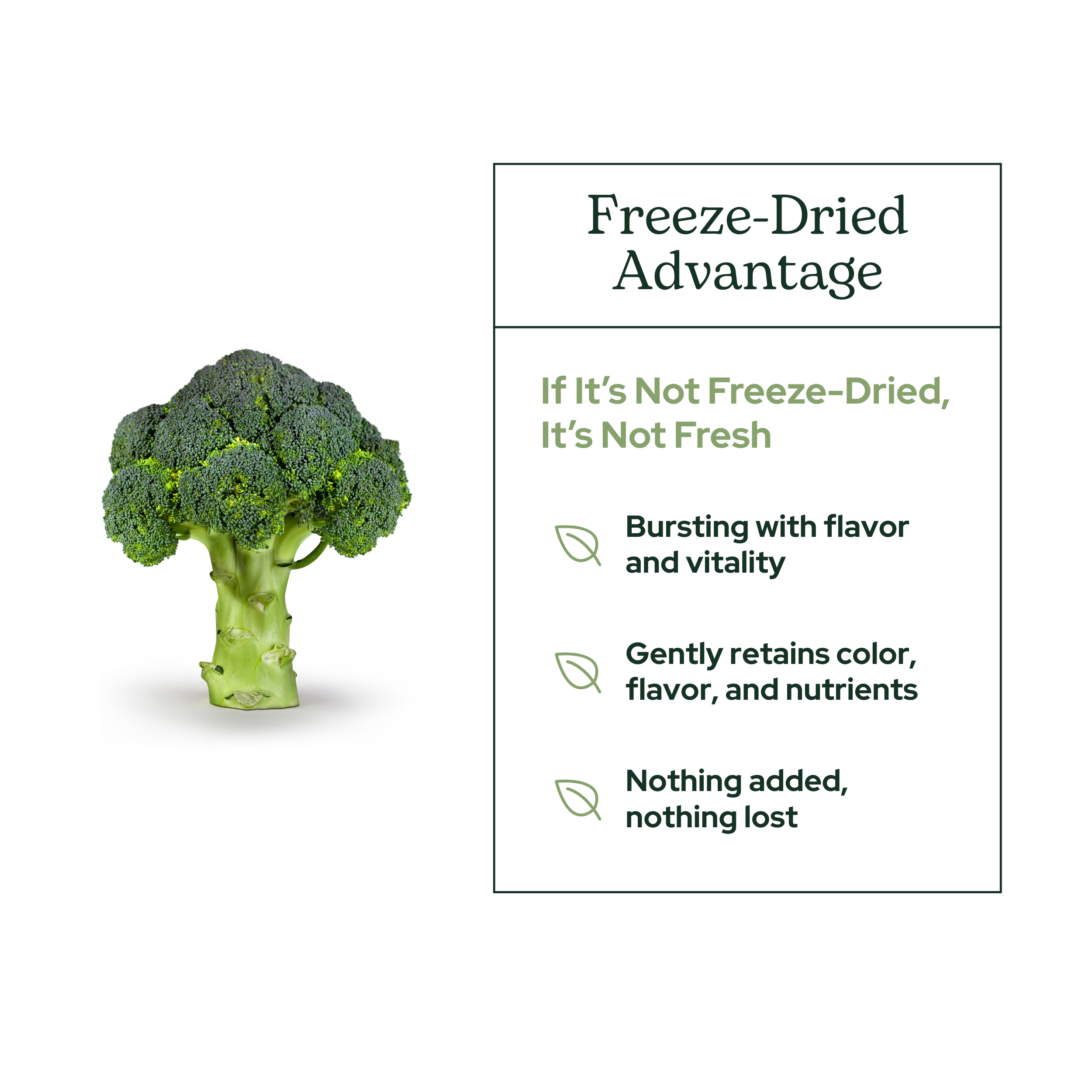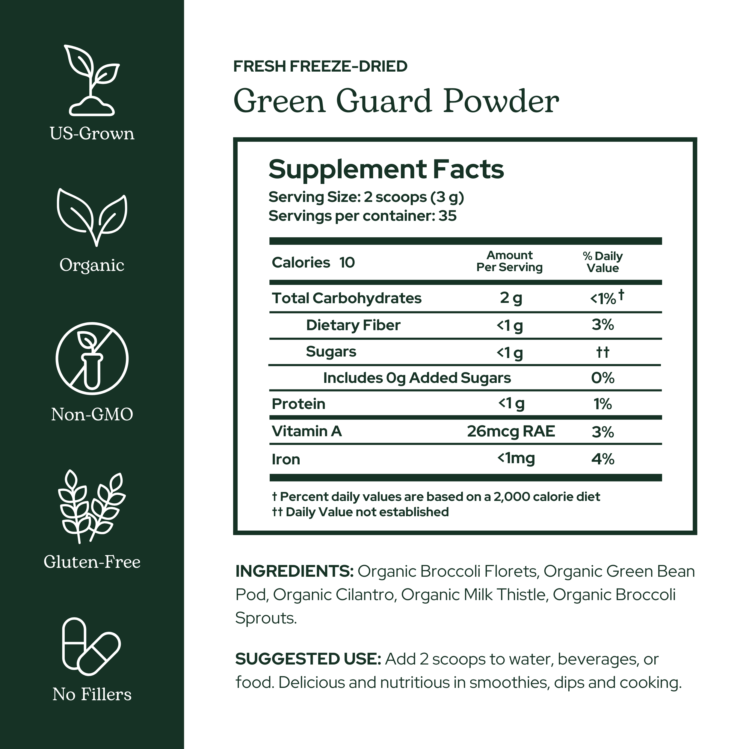 Ingredients: Raw, organic, freeze-dried broccoli, broccoli sprout, young string bean, cilantro, and milk thistle seed.