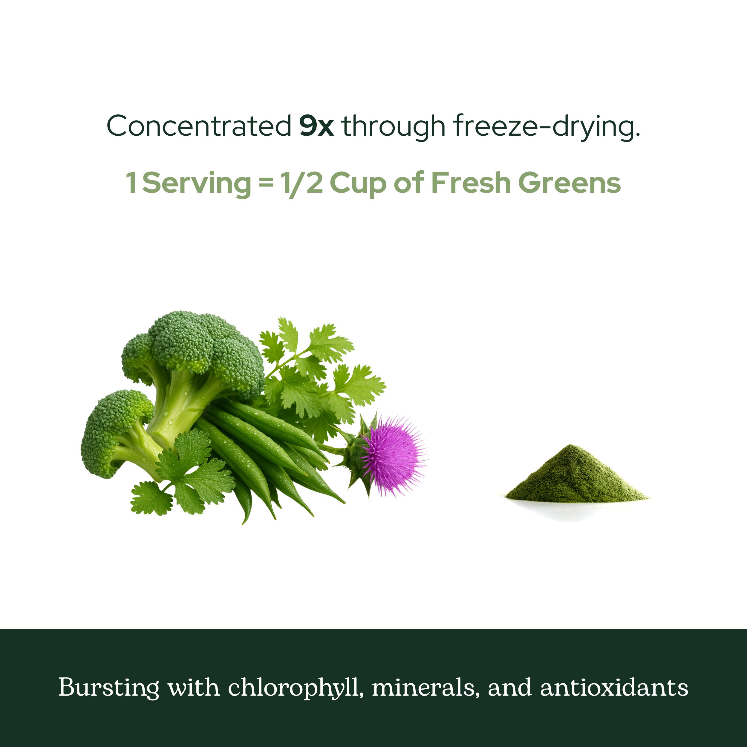 Certified US-Grown organic blend of nutrient-dense vegetables, and herbs to promote healthy detoxification and metabolism. Rich in phytonutrients from Broccoli, cilantro, and milk thistle. Small batch freeze-dried in-house to ensure peak potency.