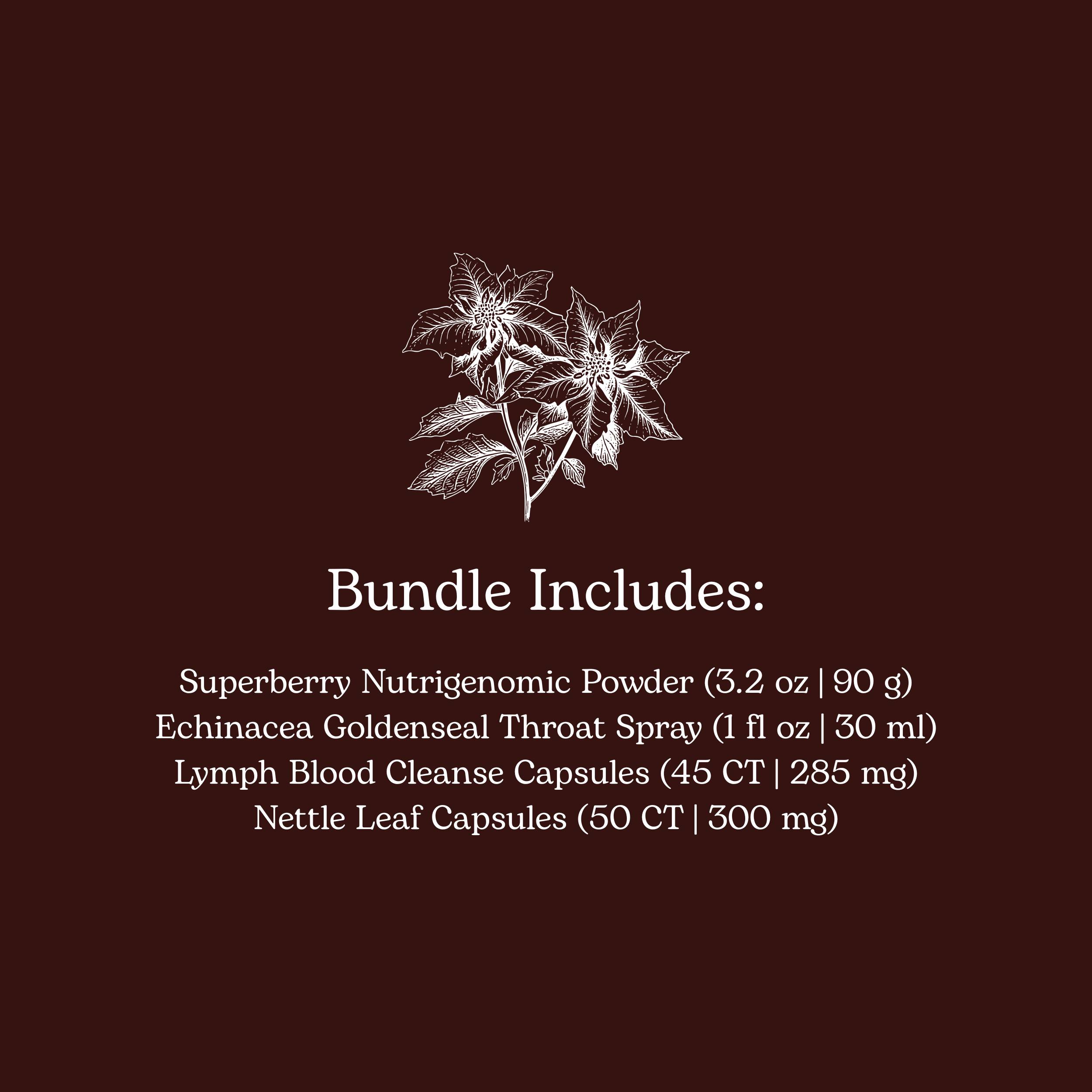Bundle Includes: Superberry Nutrigenomic Powder (3.2 oz | 90 g), Echinacea Goldenseal Throat Spray (1 fl oz | 30 ml), Lymph Blood Cleanse Capsules (45 CT | 285 mg), Nettle Leaf Capsules (50 CT | 300 mg).