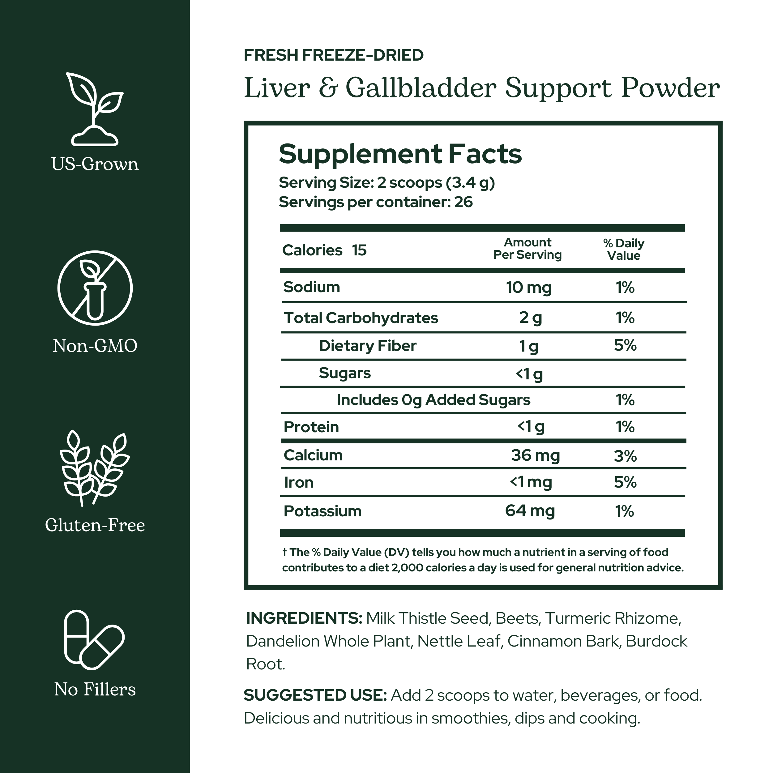 Suggested Use: 1 tbs of freeze-dried powder = 4 tbs of fresh herbs. Fill a container with 8 oz water or juice. Add 2 scoops of powder and shake well. Drink and enjoy one to three times per day. Can also be added to smoothies, dips, yogurt or other foods. Drink extra water when consuming this product.