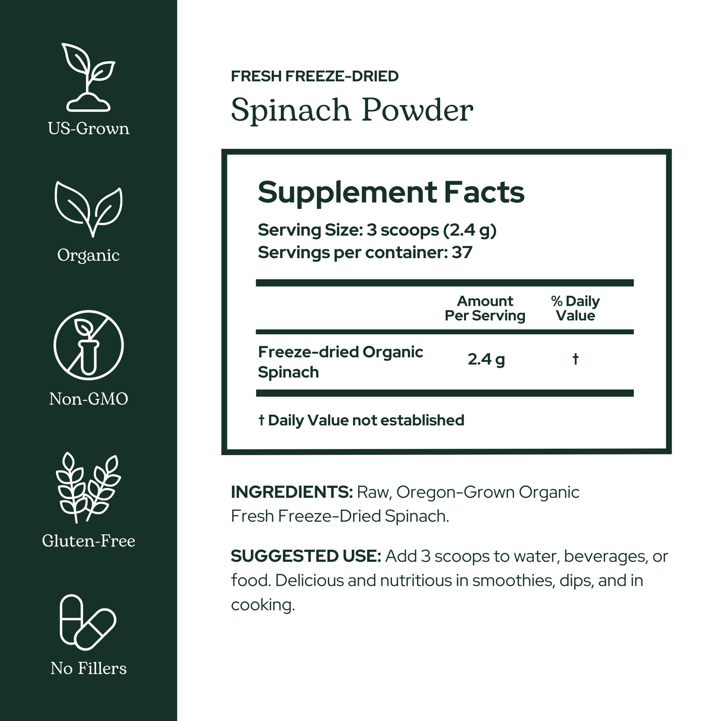 Ingredients: Raw, Oregon-grown Organic Fresh Freeze-dried Spinach.