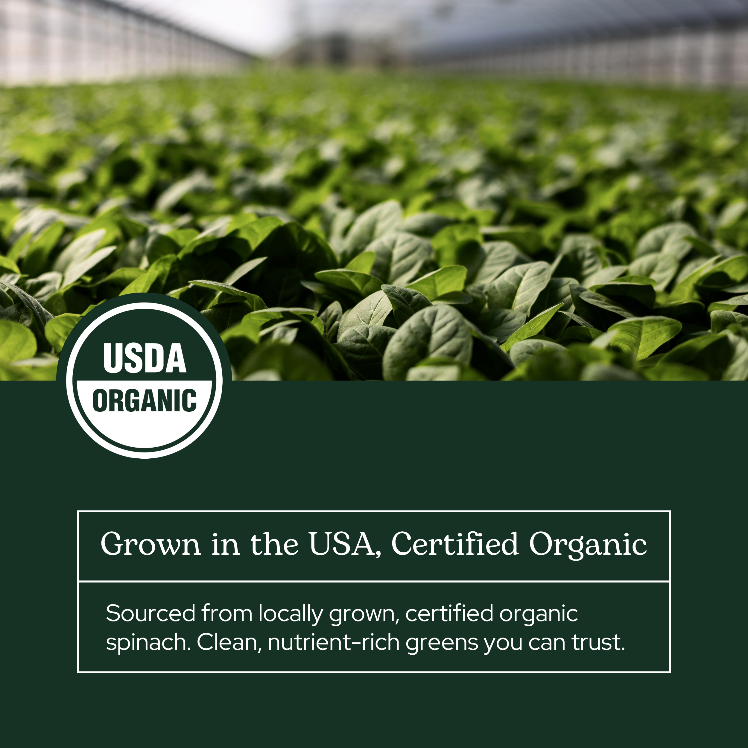 Organic locally-grown spinach is harvested at peak potency and small batch freeze-dried in-house. Our gentle freeze-drying process ensures that the plants remain whole and raw with all of the nutrition of the fresh plants. Spinach is a nutritious green that is loaded with healthy vitamins, minerals, and enzymes.*