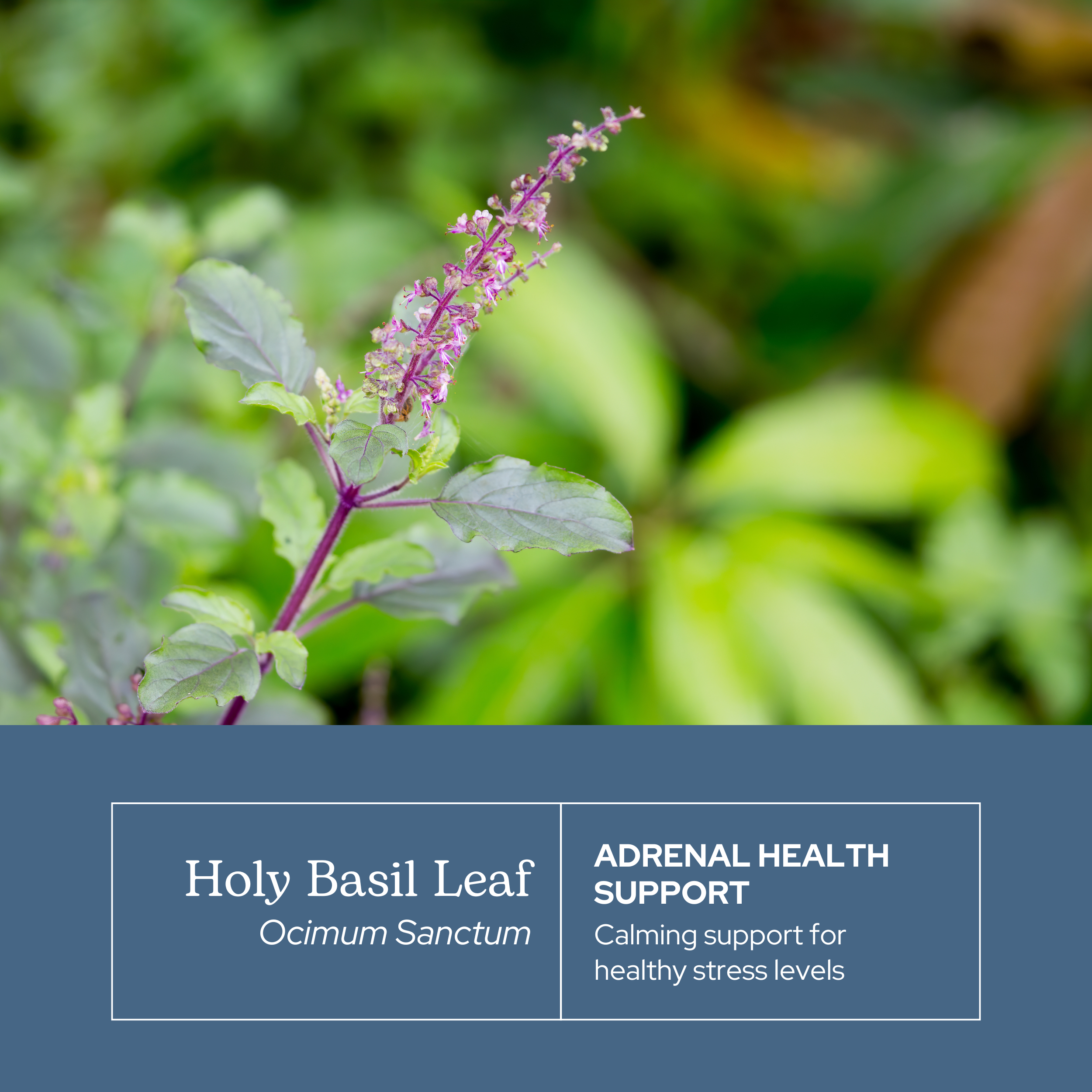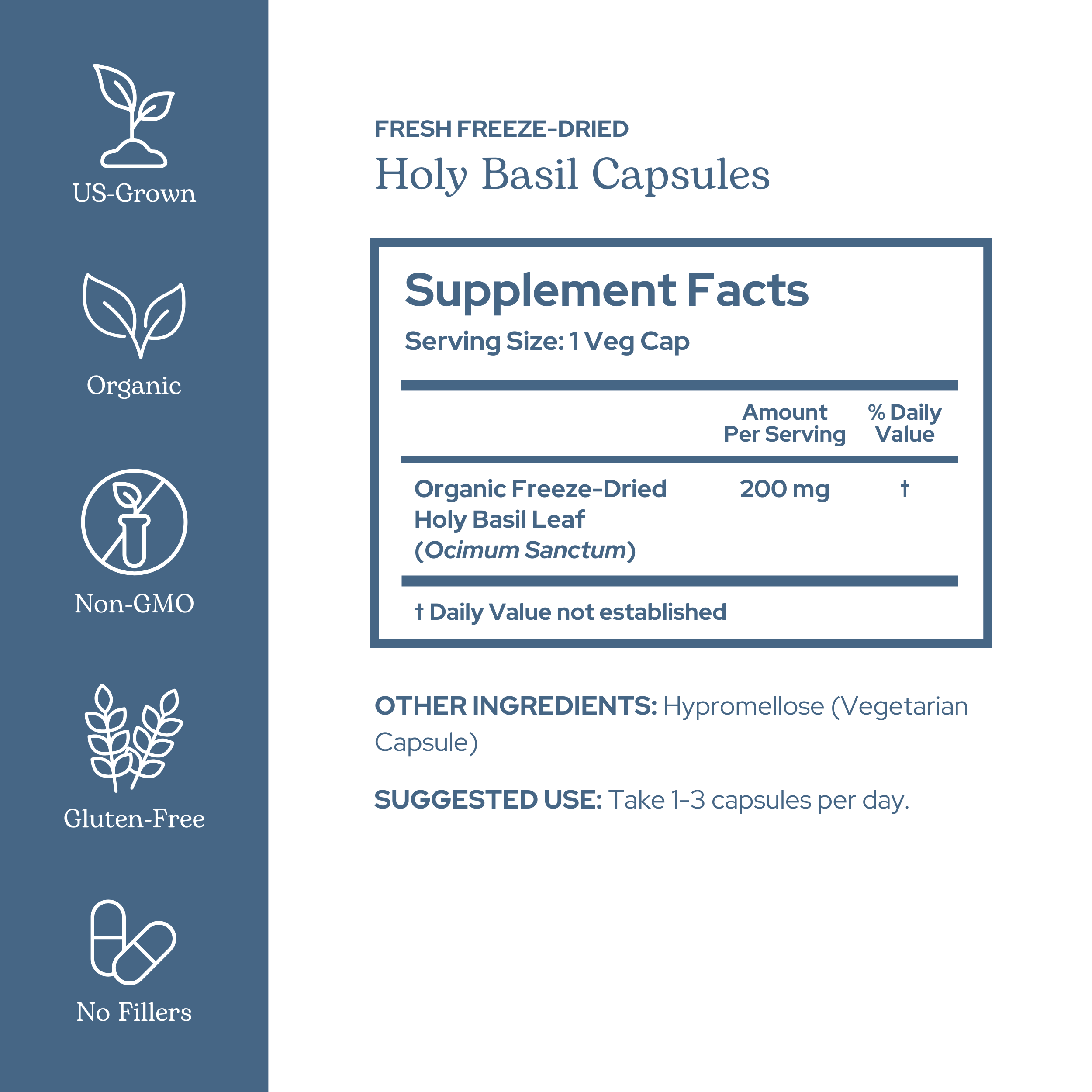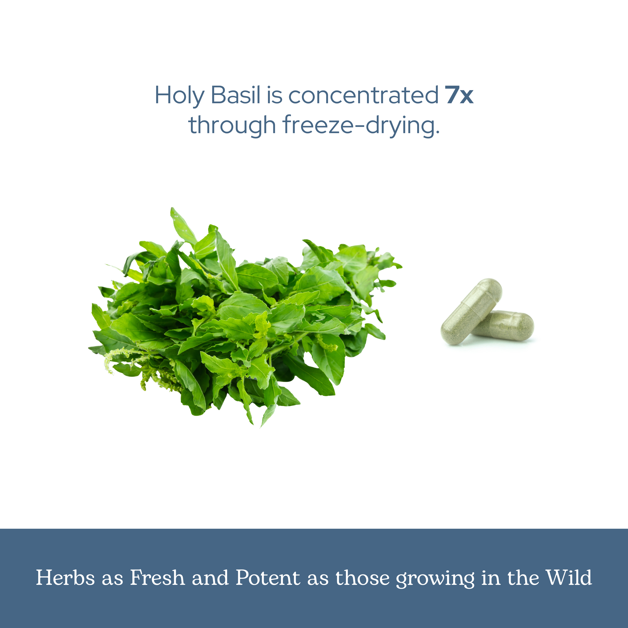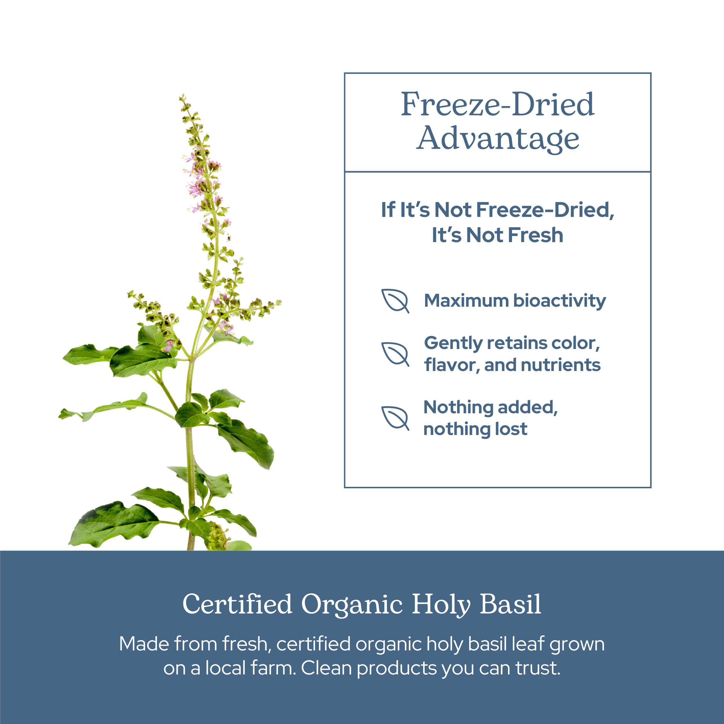 Certified organic Holy Basil is small-batch, fresh freeze-dried in-house. Freeze-drying is the best method of preserving the activity and phytochemicals of the fresh plant to support healthy stress levels.