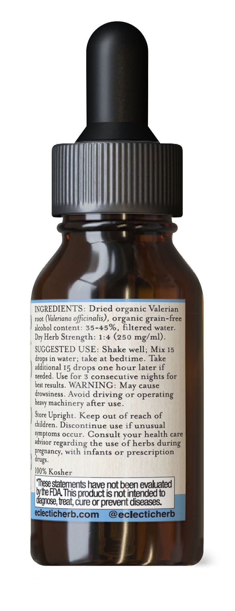 Ingredients: Organic shade-dried valerian (Valeriana officinalis) root, organic grain-free alcohol, filtered water. Dry herb strength 1:4 (250 mg /ml)
