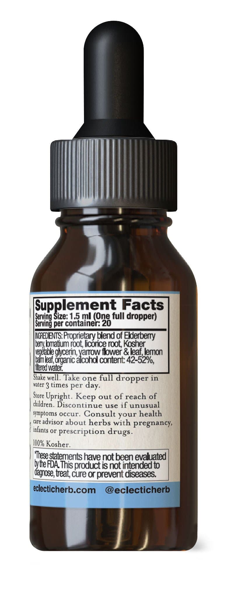 Ingredients: Herbal extract of fresh organic shade-dried elderberry (Sambucus nigra) berry, wildcrafted shade-dried lomatium (Lomatium dissectum) root, shade-dried licorice (Glycyrrhiza glabra) root, Kosher vegetable glycerin, wildcrafted fresh yarrow (Achillea millefolium) flower & leaf, organic shade-dried lemon balm (Melissa officinalis) leaf, organic alcohol, filtered water.