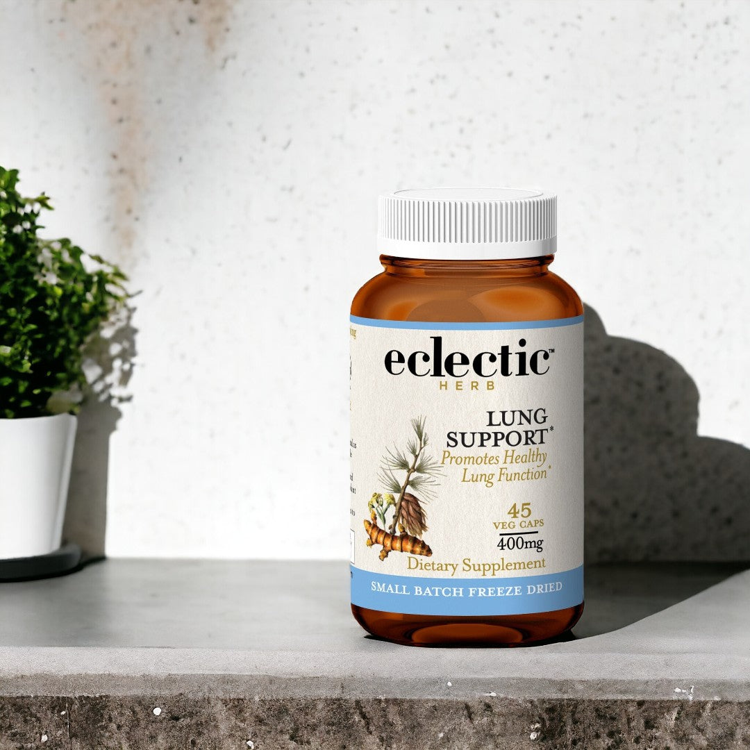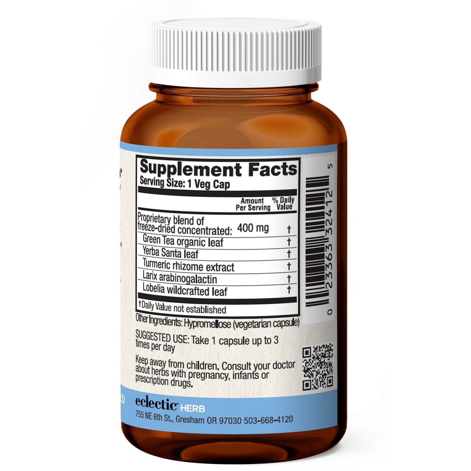 Ingredients: Raw freeze-dried concentrate of organic Gumweed (Grindelia robusta) flower and leaf, concentrate of Green Tea (Camellia sinensis) leaf, wildcrafted Lobelia (Lobelia inflata) leaf, Larix arabinogalactan (Larix occidentalis), Turmeric (Curcuma longa) rhizome.
