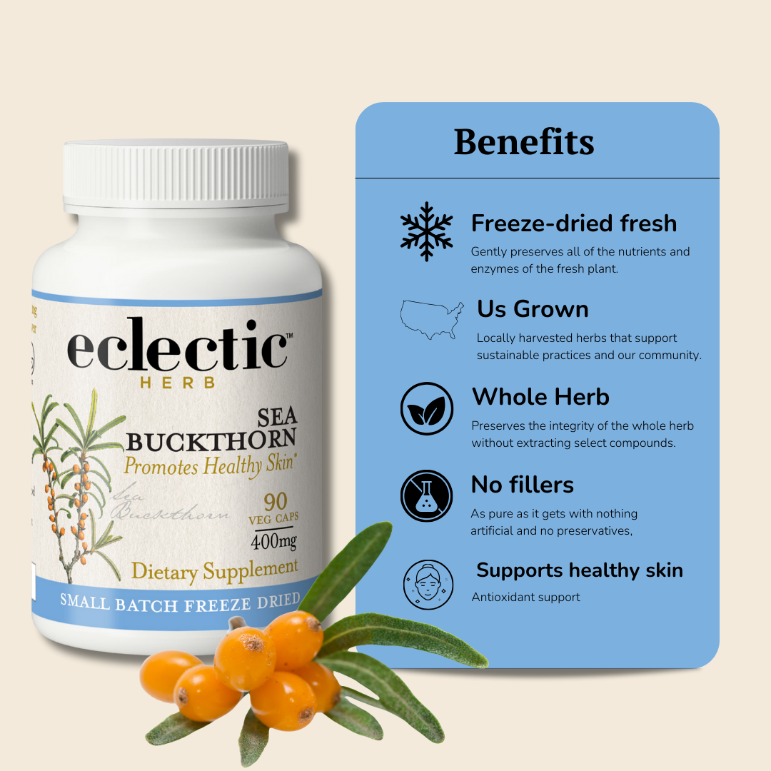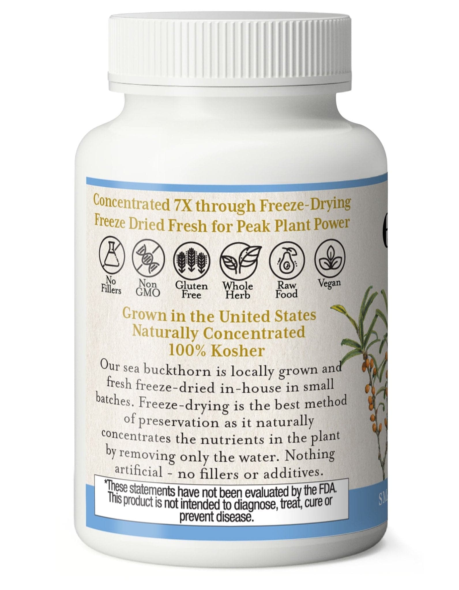 Ingredients: Fresh freeze-dried, raw, wildcrafted, US-grown Sea Buckthorn fruit (Hippophae rhamnoides), and Larix arabinogalactan.