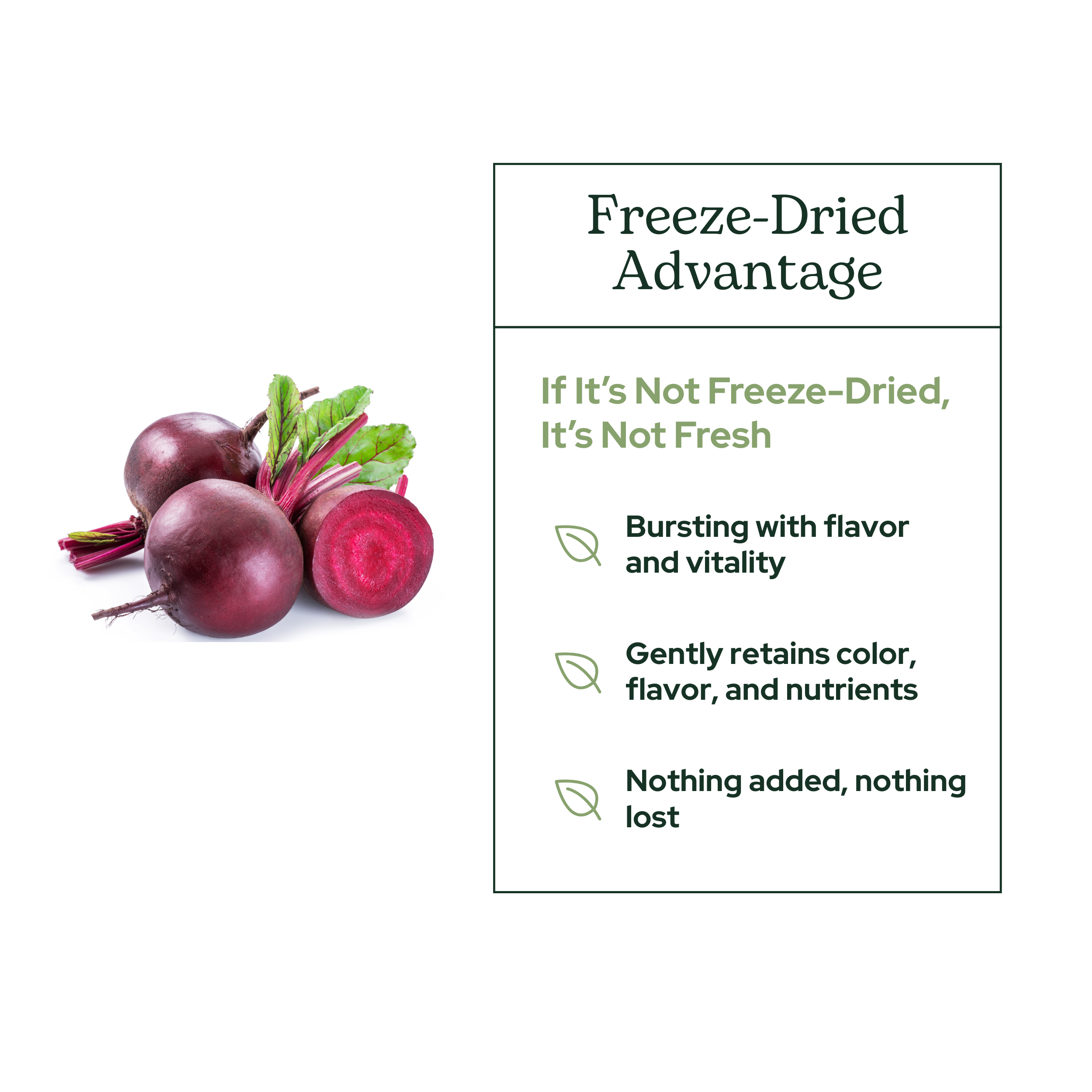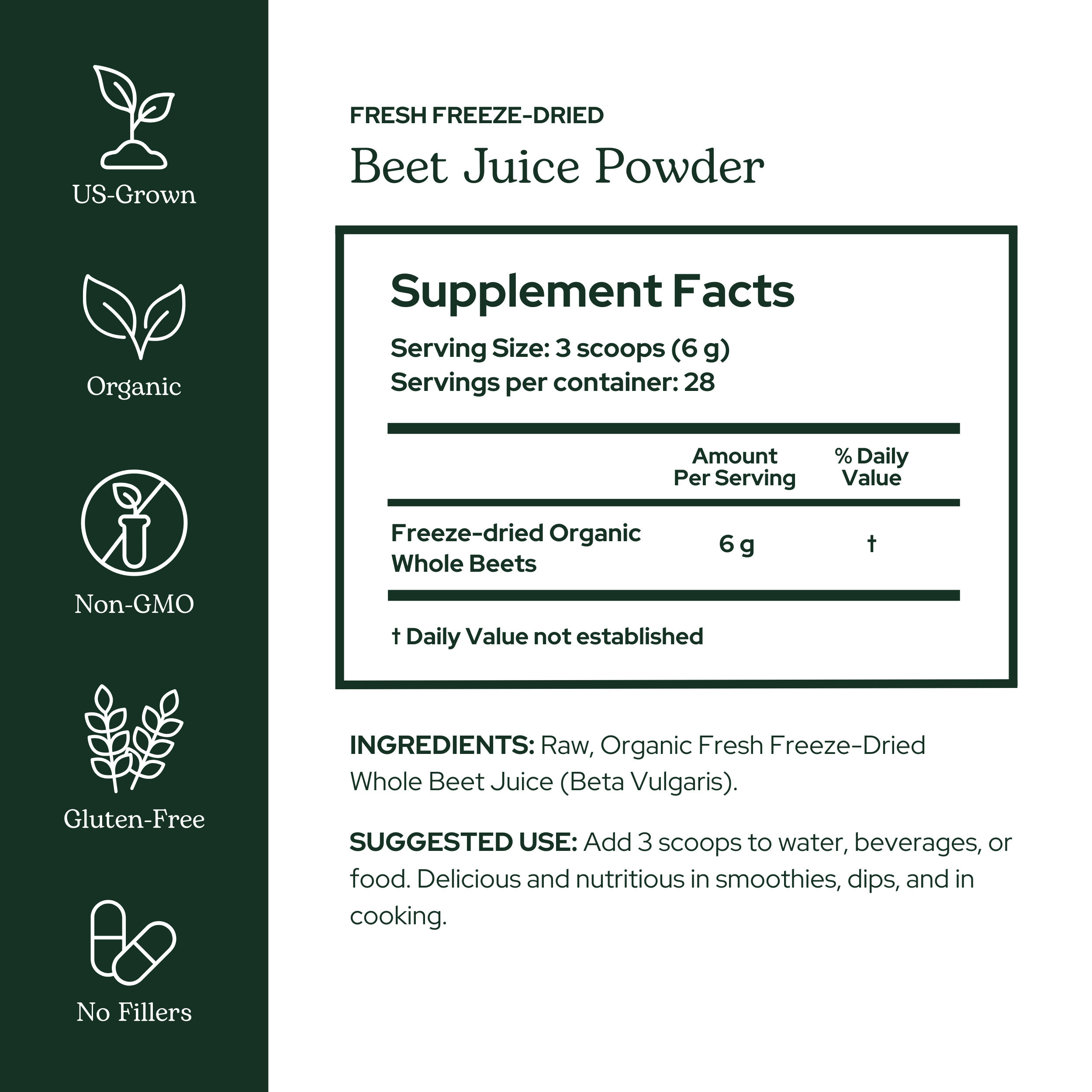 Ingredients: Raw, locally-sourced, US-grown, Organic, Fresh Freeze-dried whole beet juice (Beta vulgaris)