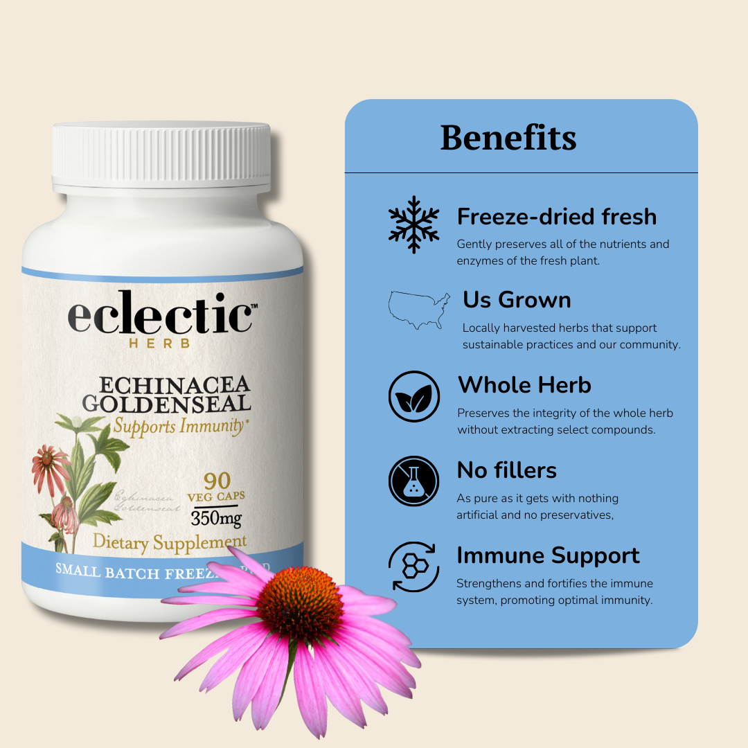 - A combination of sustainably harvested fresh freeze-dried echinacea and goldenseal.