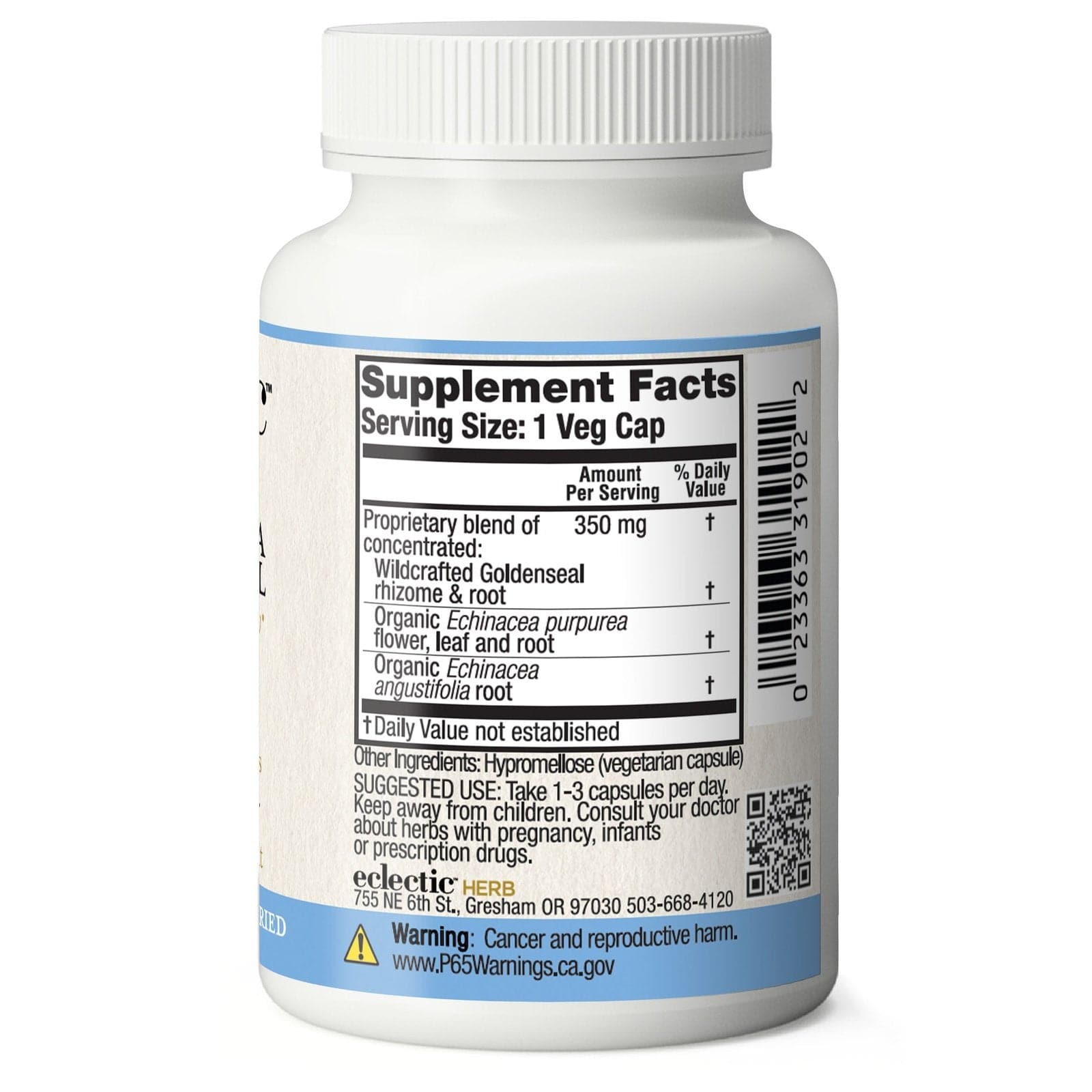 Ingredients: Raw US-Grown Fresh Freeze-dried goldenseal rhizome & root (Hydrastis canadensis), organic echinacea angustifolia root, organic echinacea purpurea flower, leaf, and root.