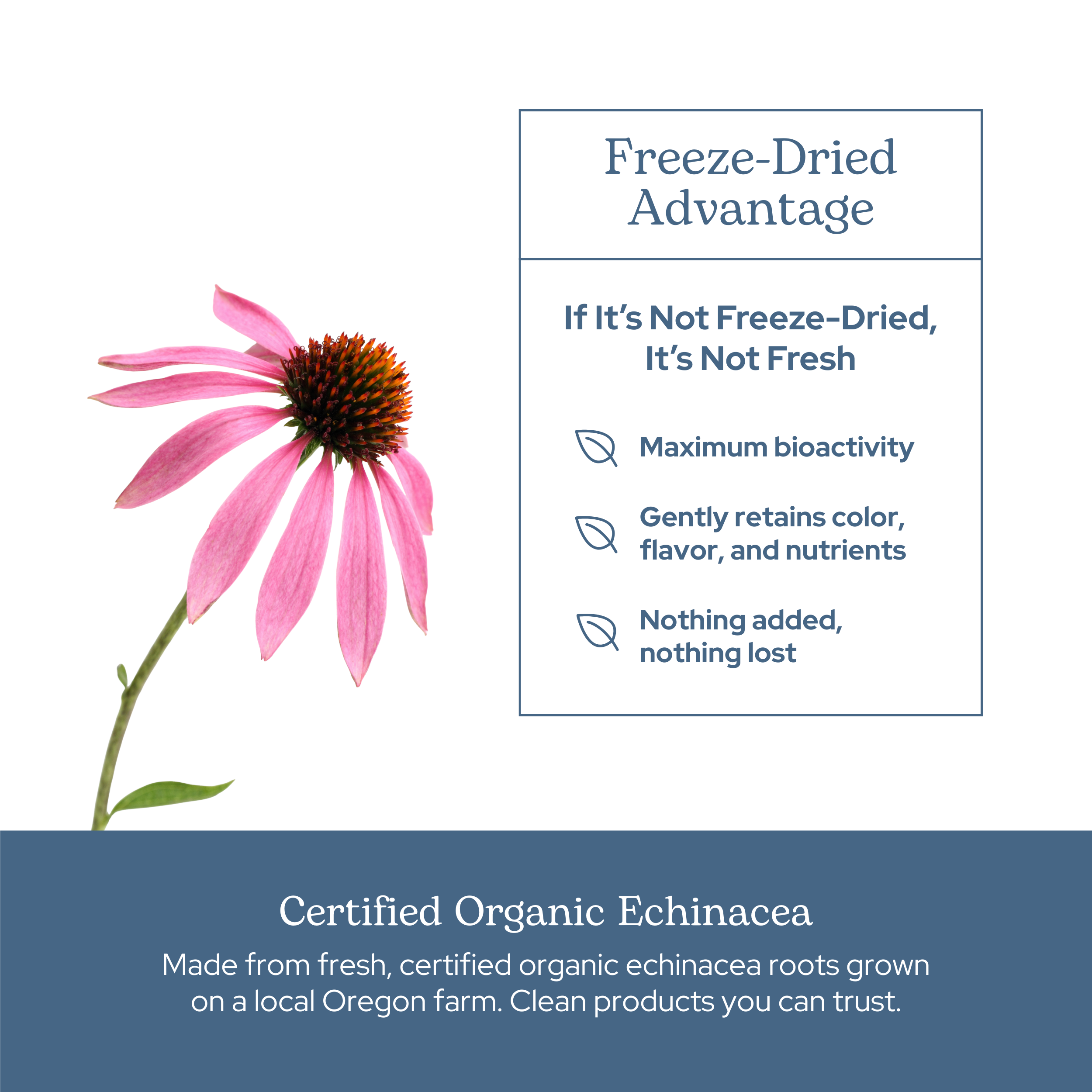 - Oregon-grown, organic, whole, raw Echinacea is fresh freeze-dried in-house.