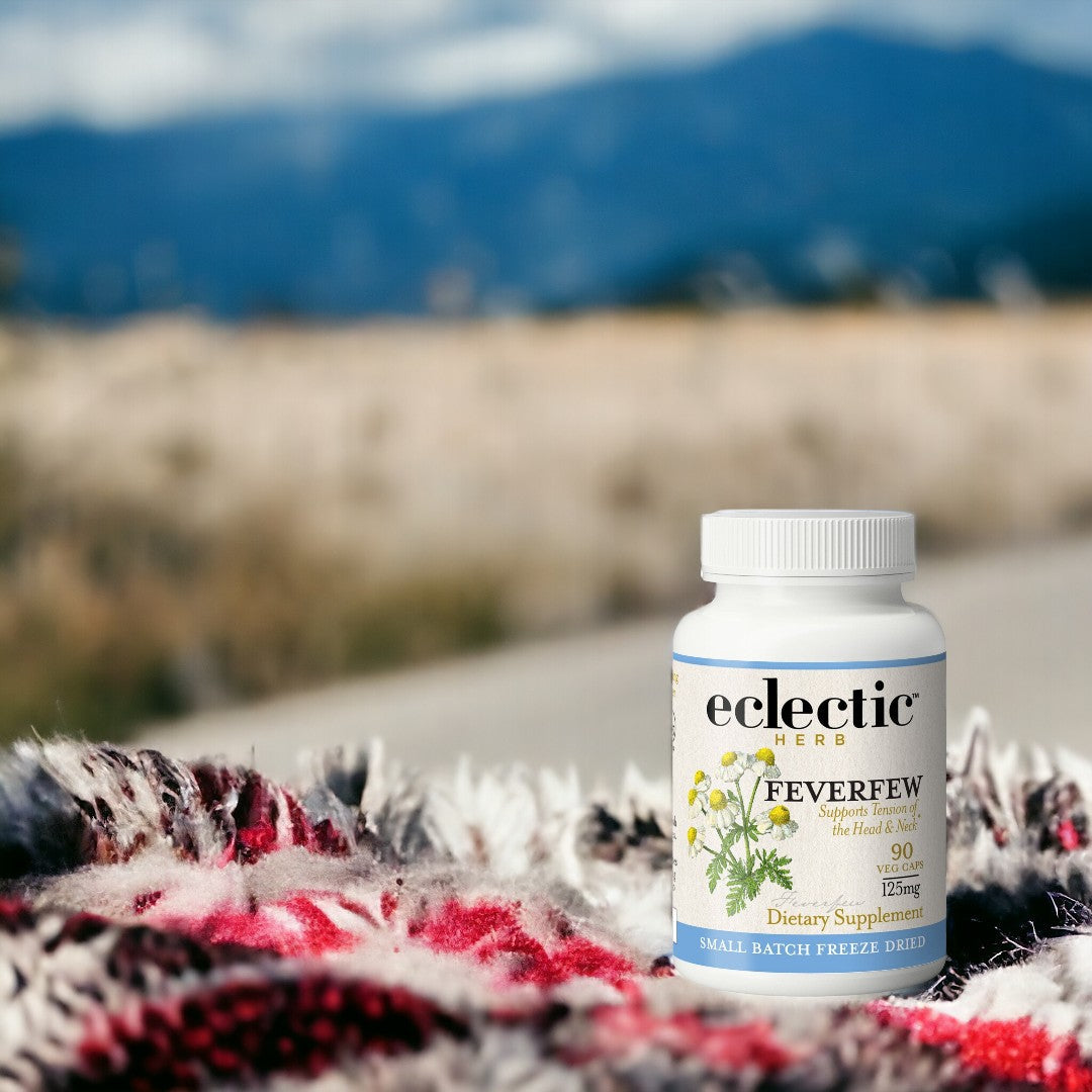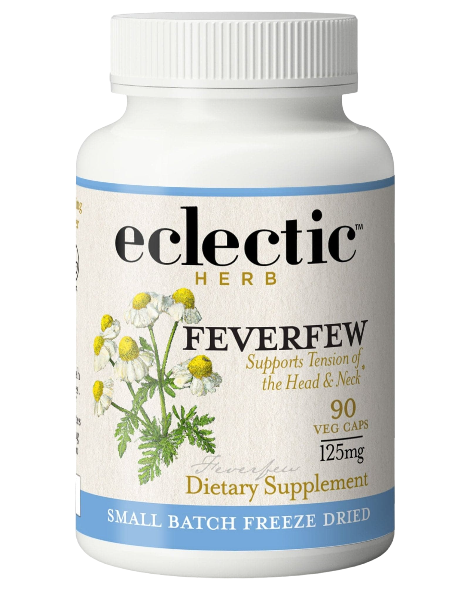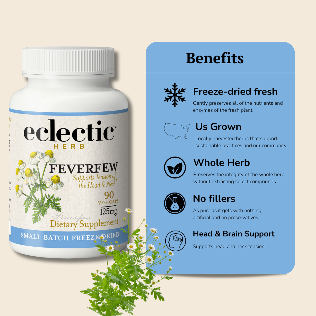 • Organic Oregon-grown feverfew flowers are picked at peak potency and fresh freeze-dried in-house.