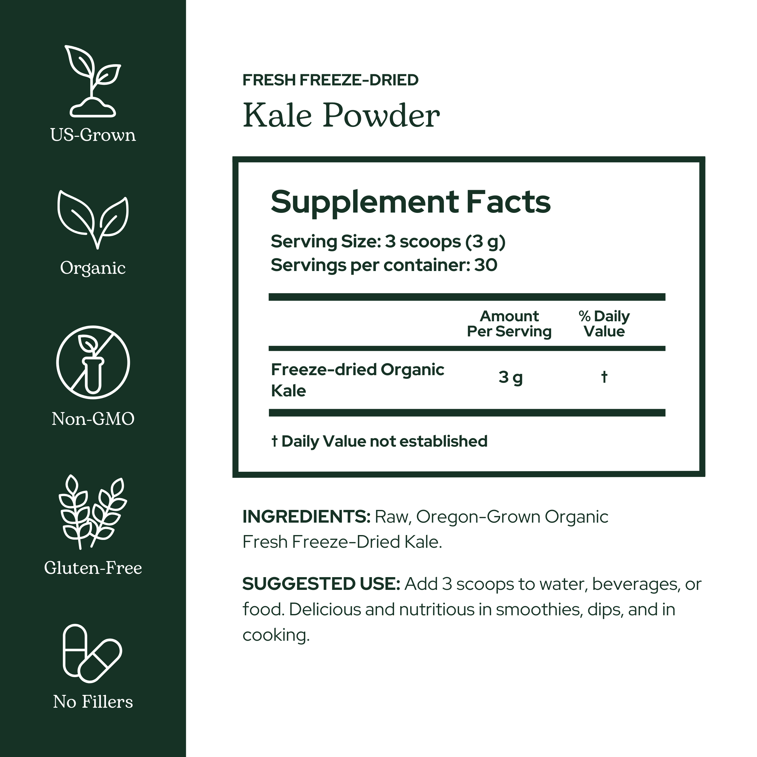 Ingredients: Raw, Oregon-grown Organic Fresh Freeze-dried Kale.