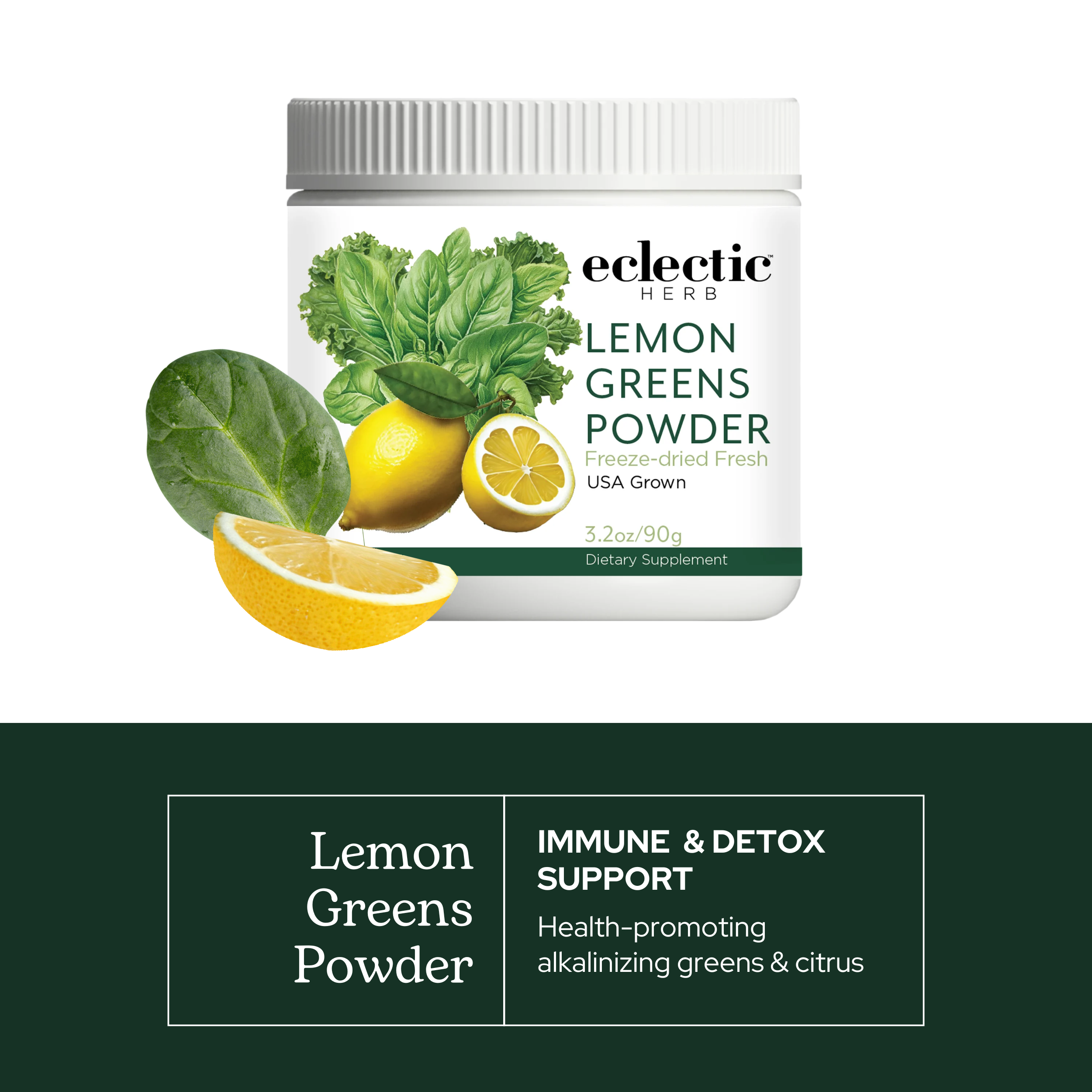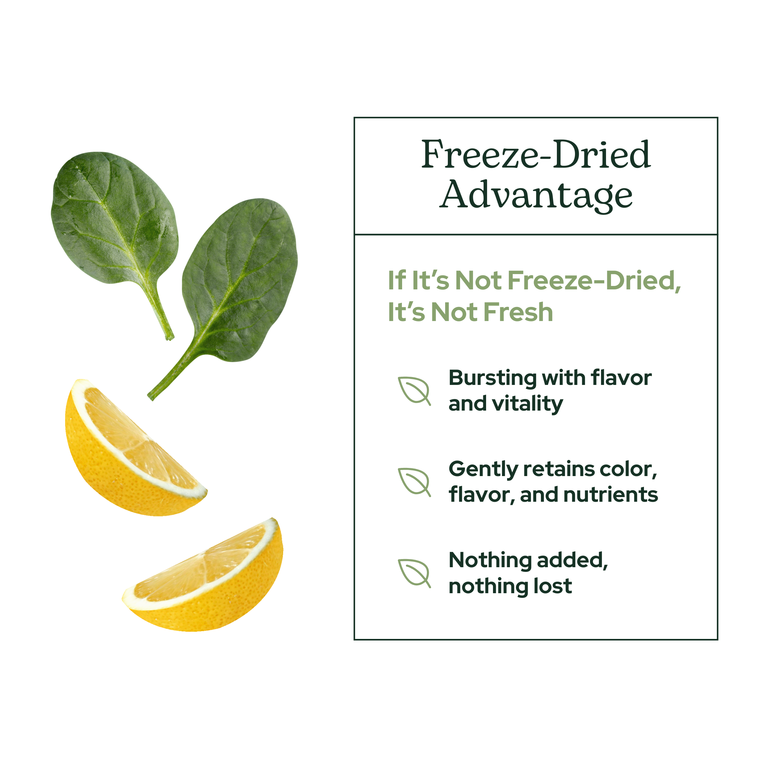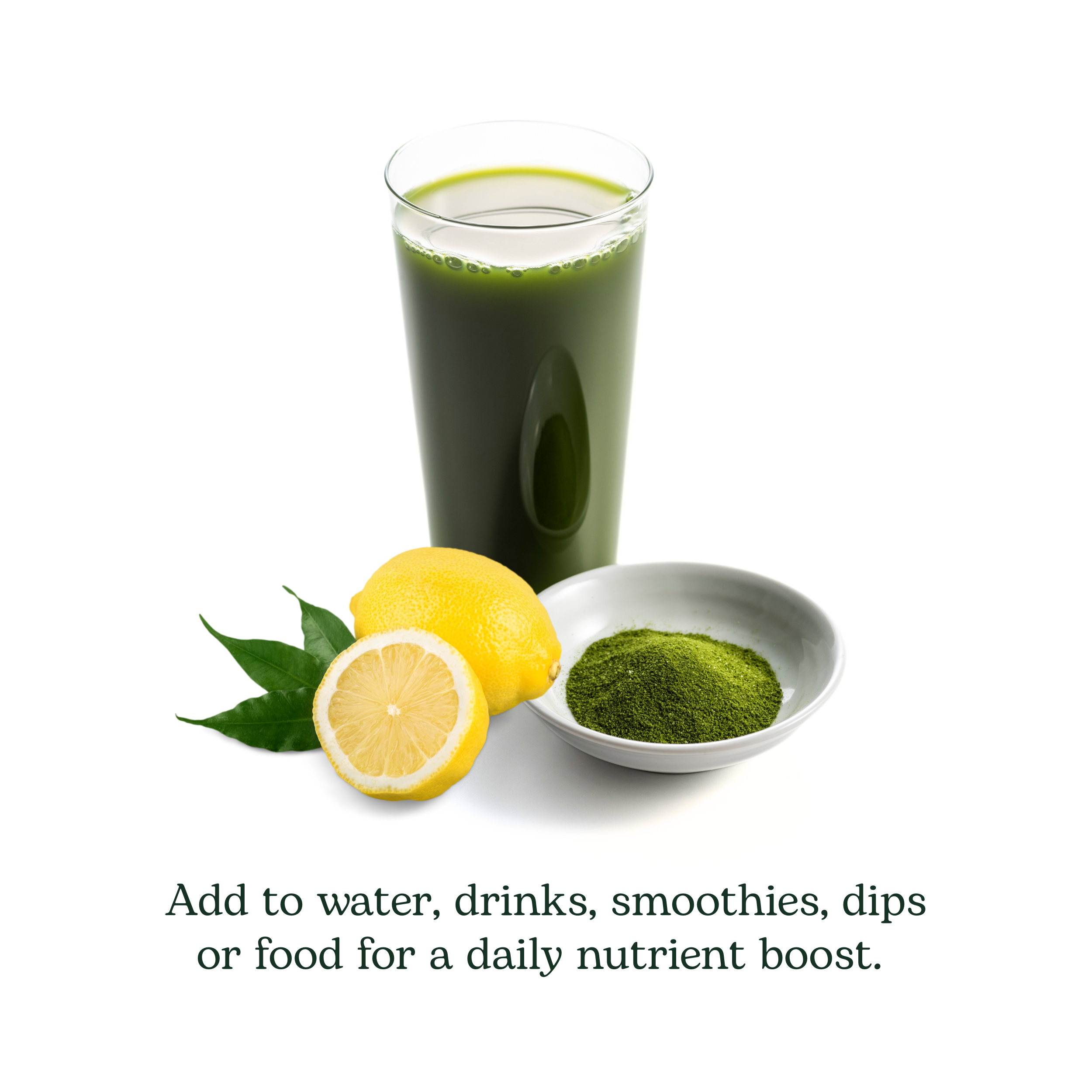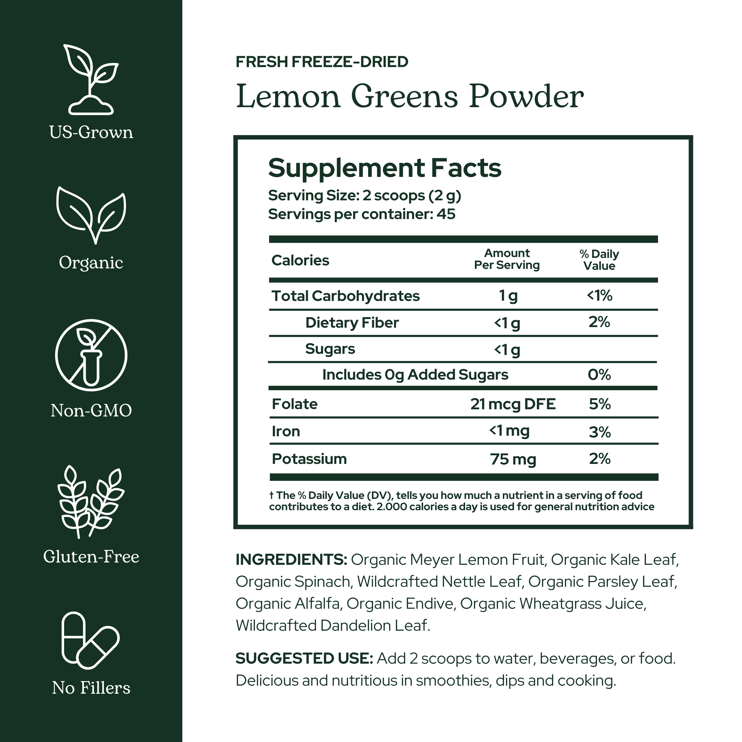 Ingredients: Raw, organic, whole, freeze-dried Meyer lemons, kale, spinach, parsley, alfalfa, wheatgrass juice, endive, dandelion leaf; raw, wildcrafted, freeze-dried stinging nettle leaf.