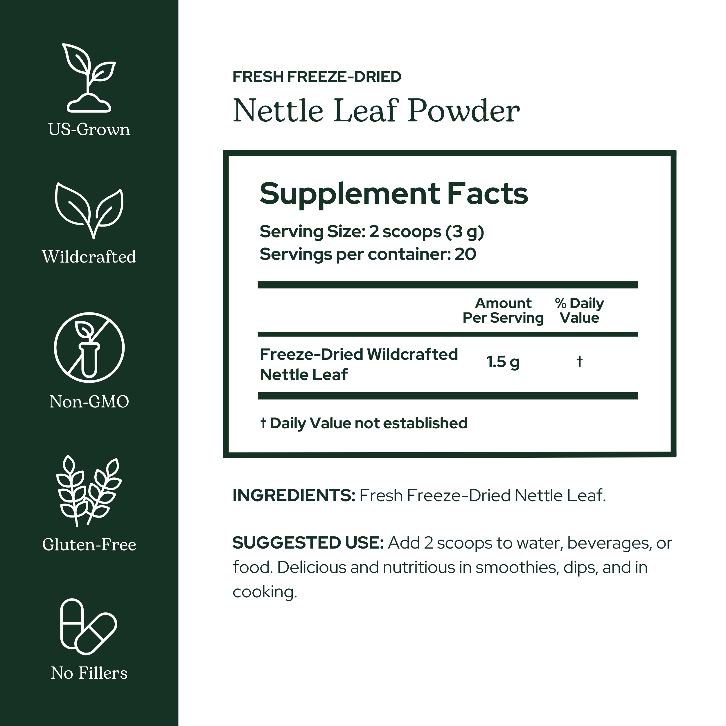Ingredients: Raw, US-Grown Wildcrafted Fresh Freeze-dried Stinging Nettle leaf (Urtica dioica)