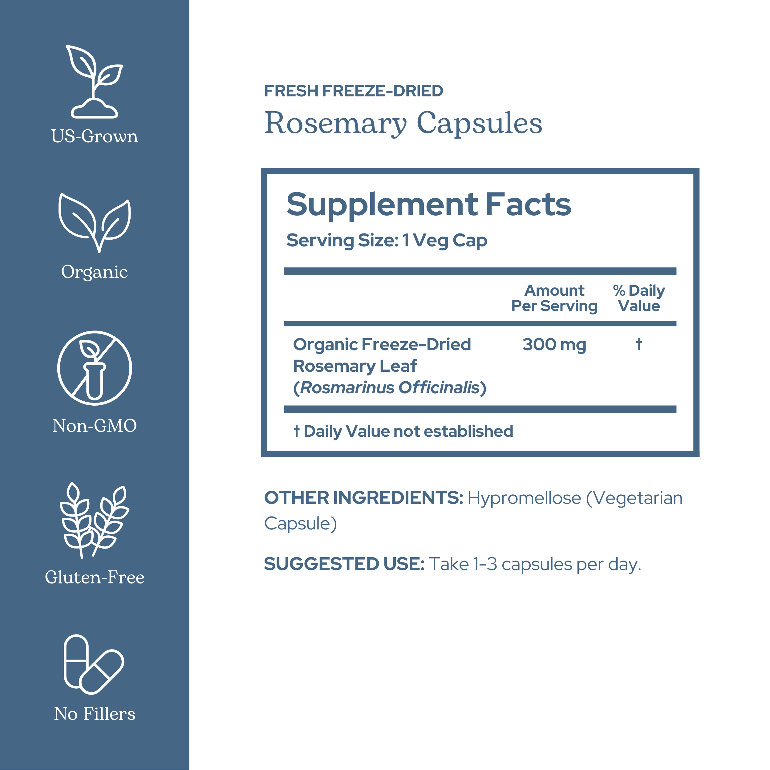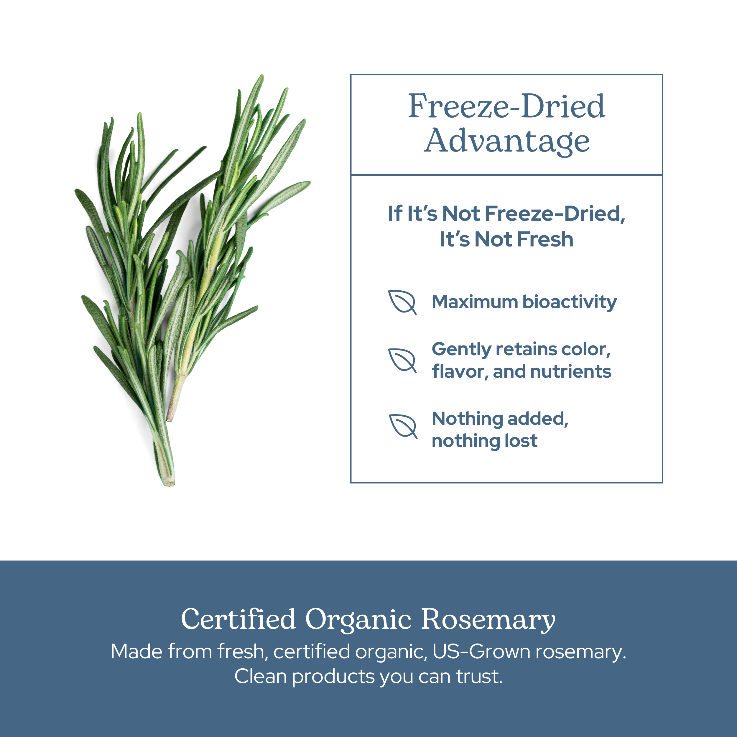 Ingredients: Fresh freeze-dried, raw, organic, US-grown Rosemary leaf (Rosmarinus officinalis)