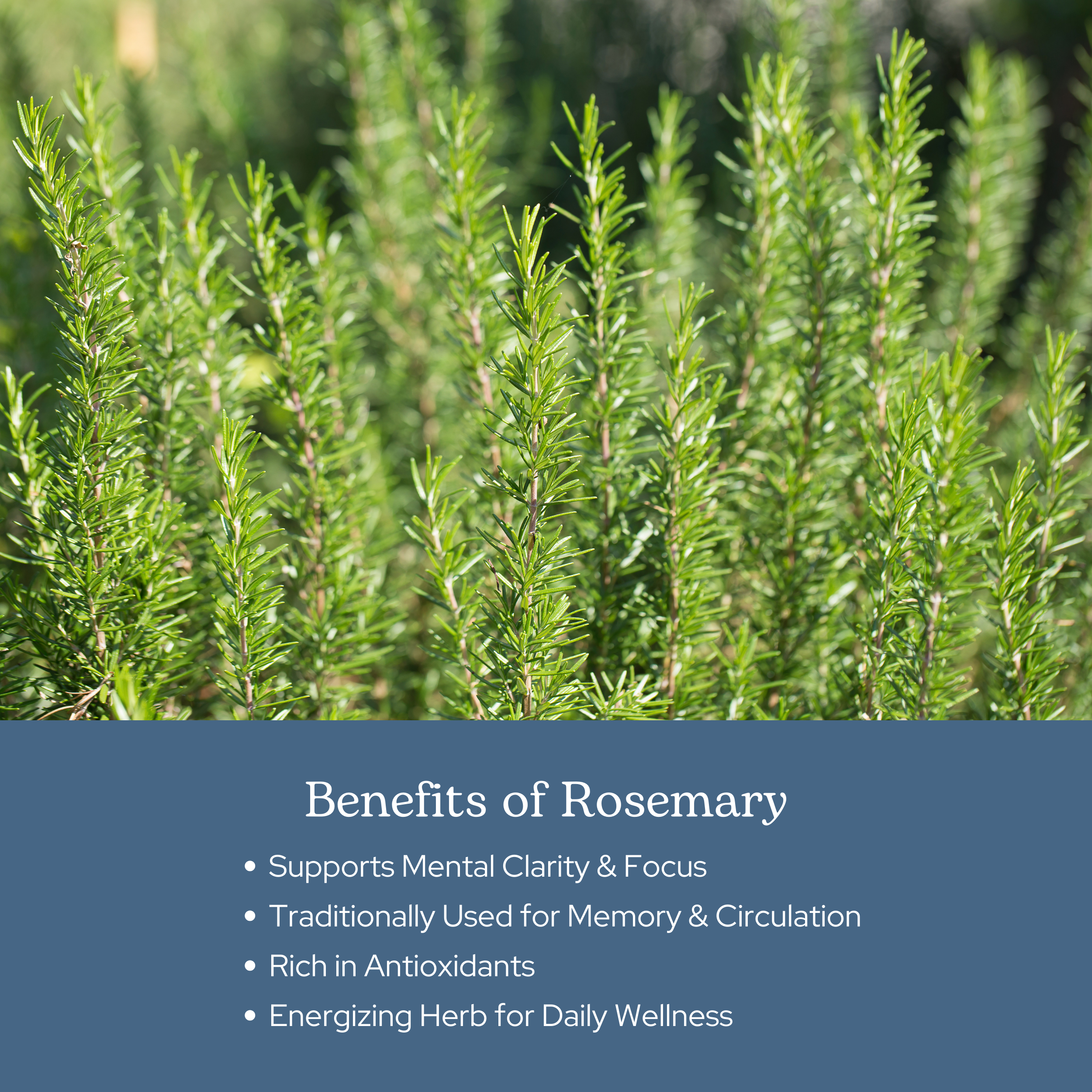 Rosemary is characterized by its warming and slightly drying energetics. It's rich in essential oils like cineole, camphor, and alpha-pinene, which contribute to its cognitive and mood-enhancing effects. Rosemary is also a source of antioxidants, such as rosmarinic acid and carnosic acid, known for their ability to support brain health and combat oxidative stress.