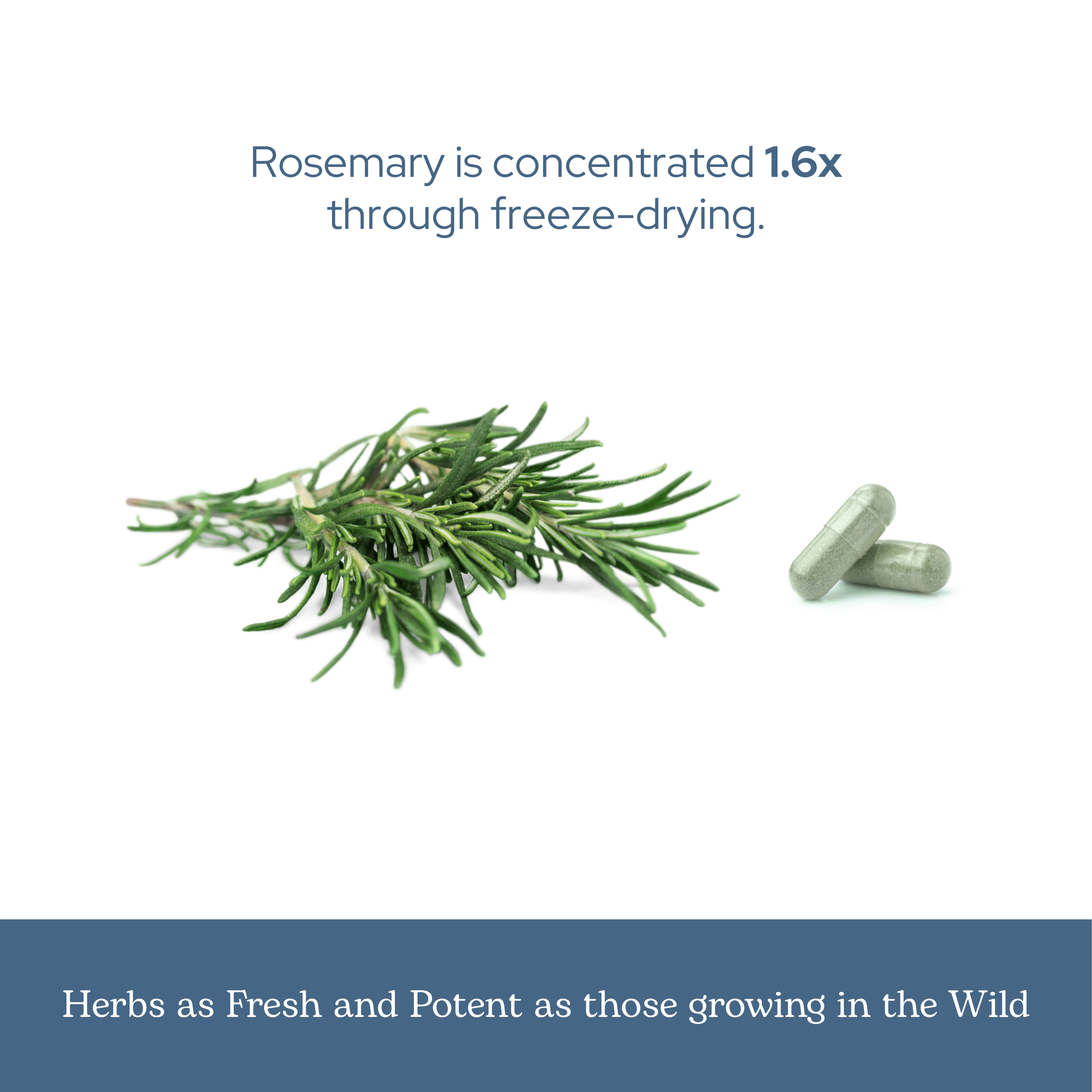 Our Freeze-Dried Rosemary Capsules are made from sustainable rosemary grown in Oregon, and undergo an innovative freeze-drying process, which ensures the preservation of its aromatic oils and potent properties.