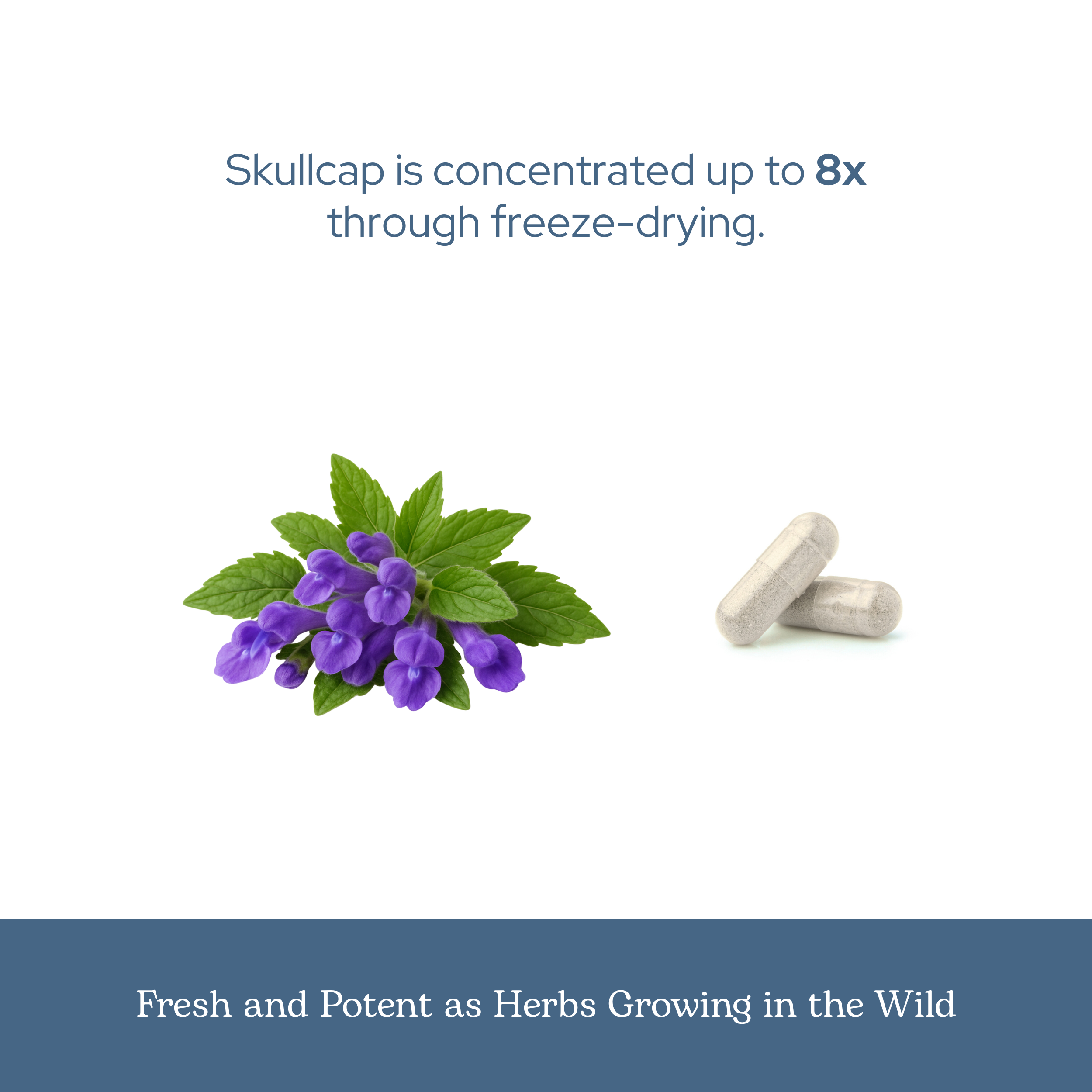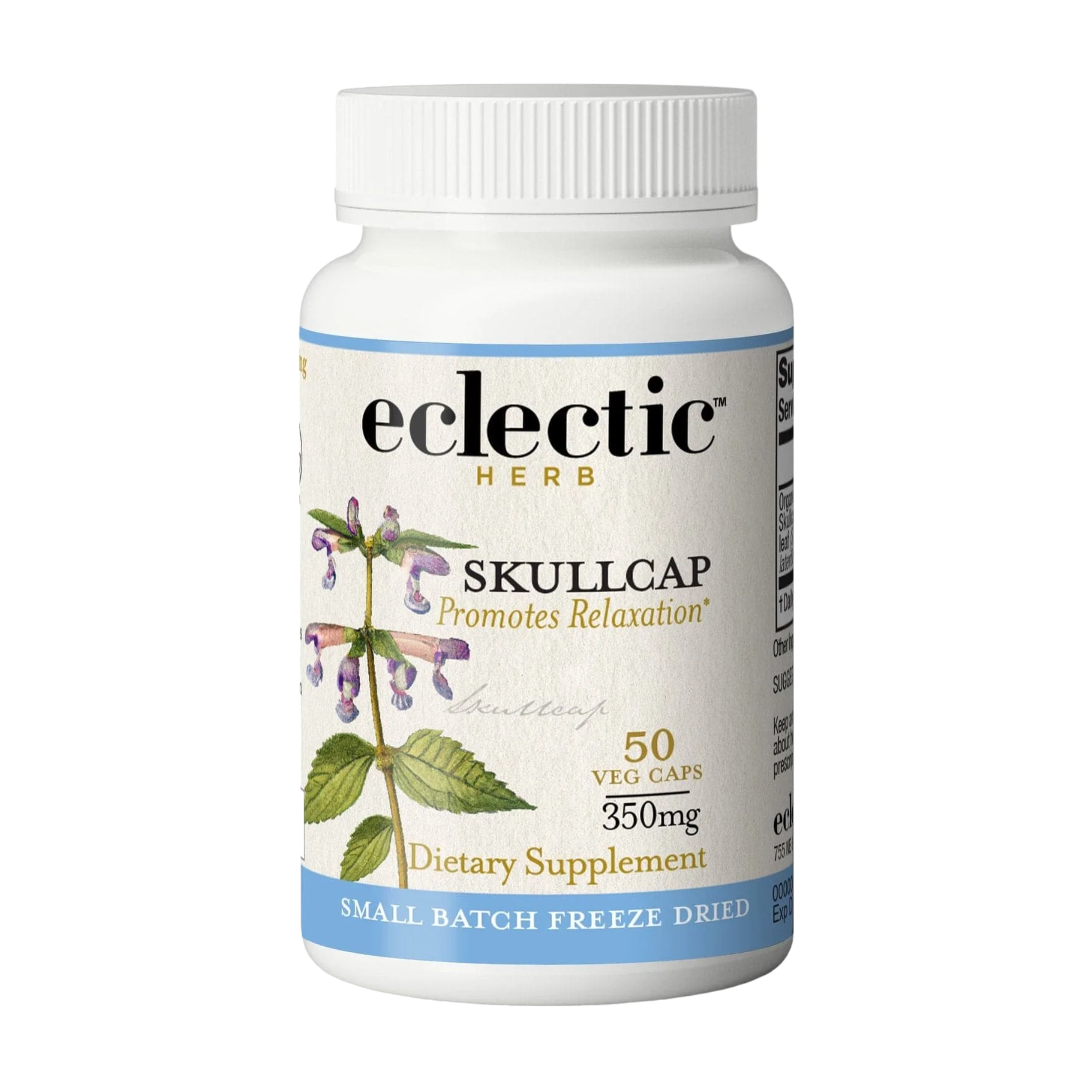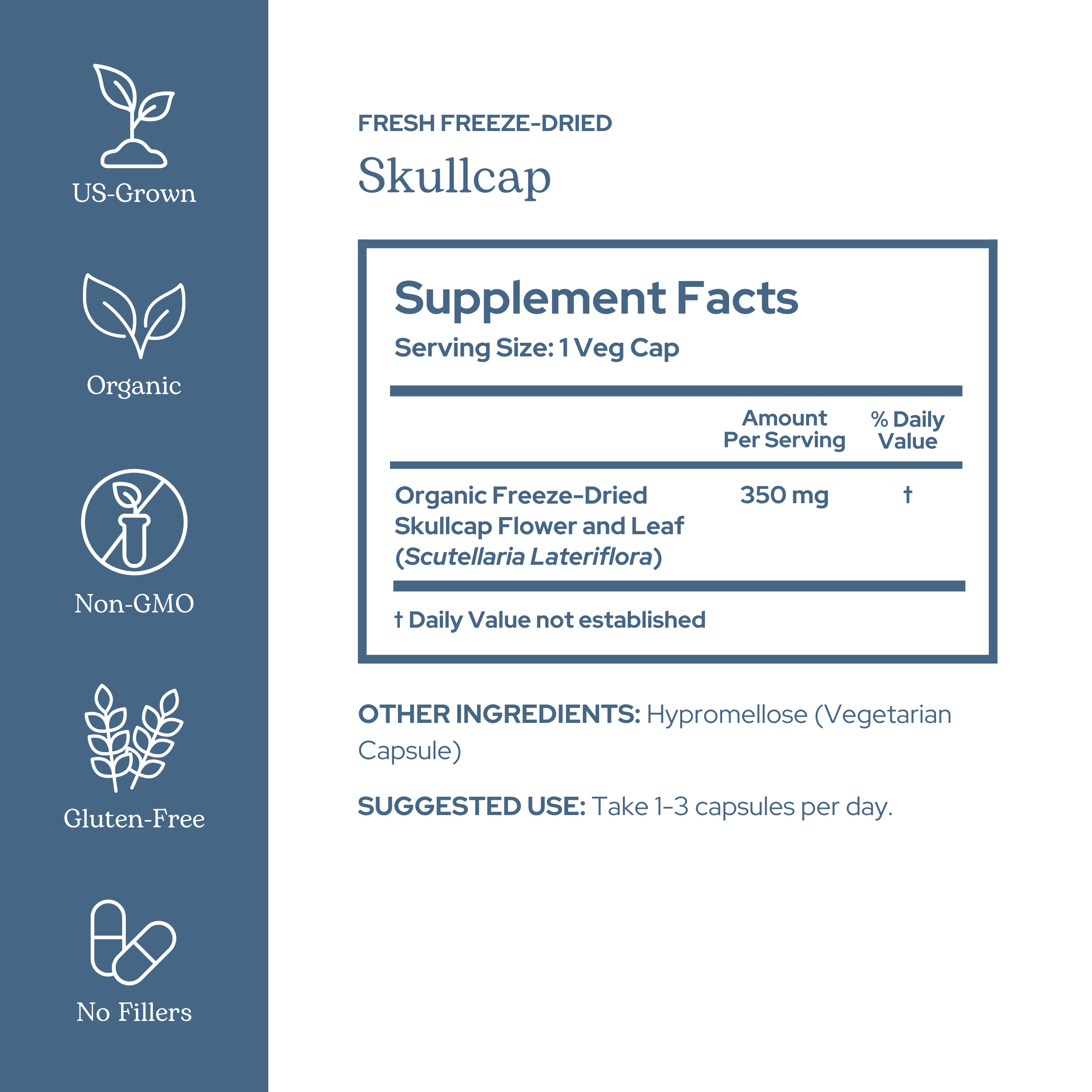 - Certified organic Oregon-grown skullcap is harvested at peak potency and fresh freeze-dried in-house.