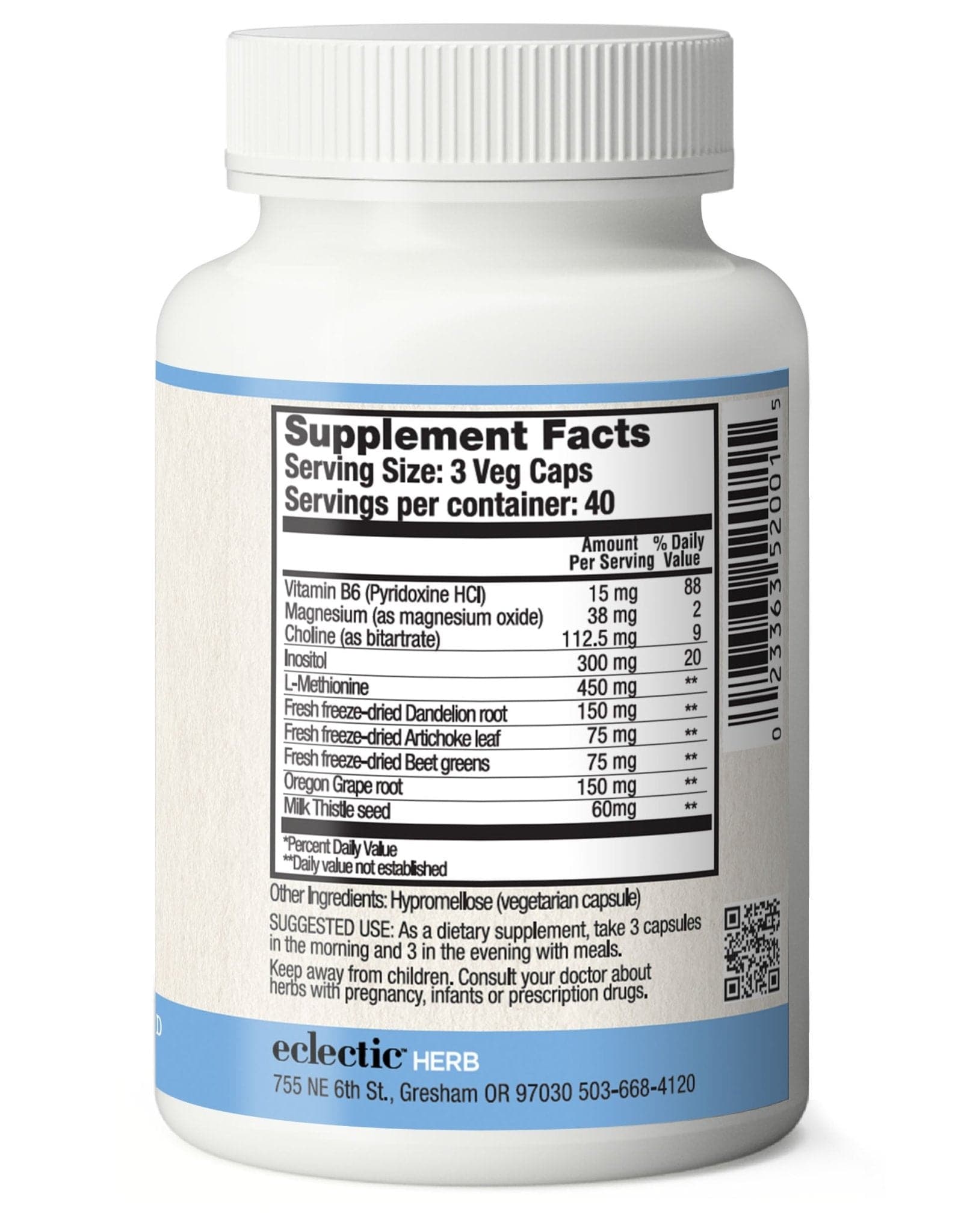 Ingredients: Vitamin B6, Magnesium, Choline, Inositol, L-Methionine, Dandelion Root, Artichoke Leaf, Beet Greens, Oregon Grape Root, Milk Thistle Seed.